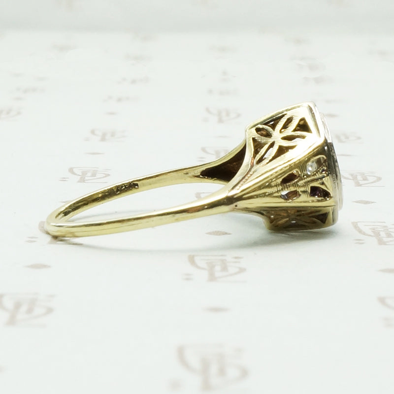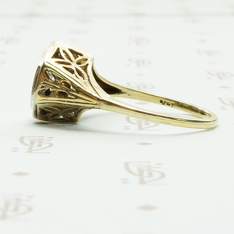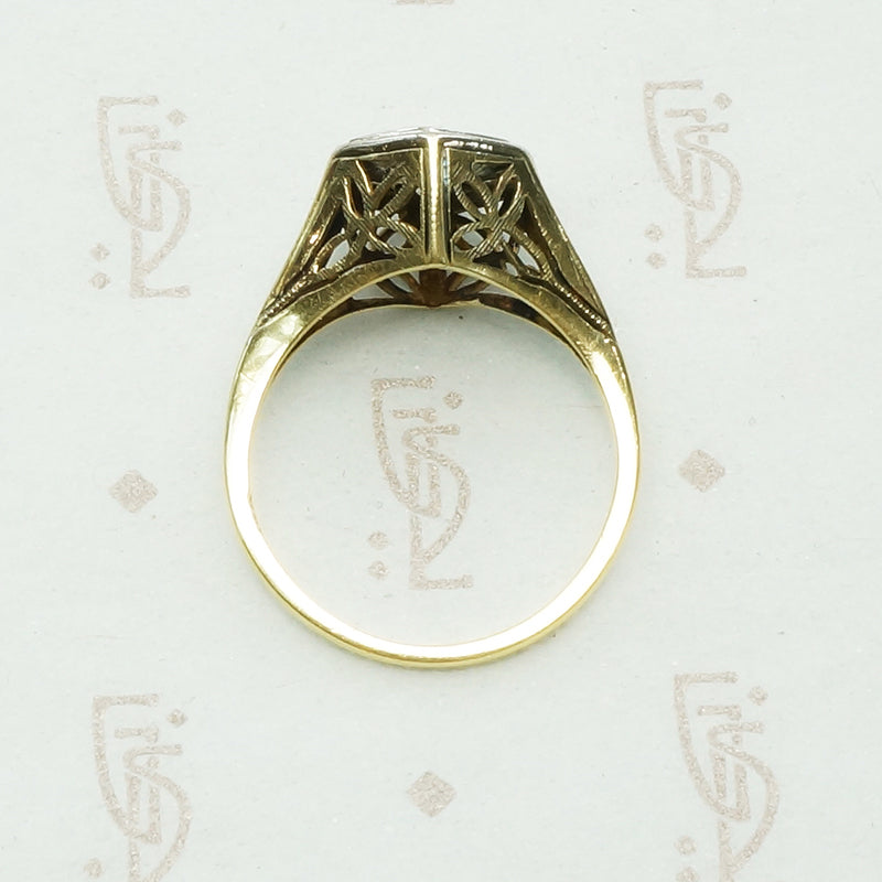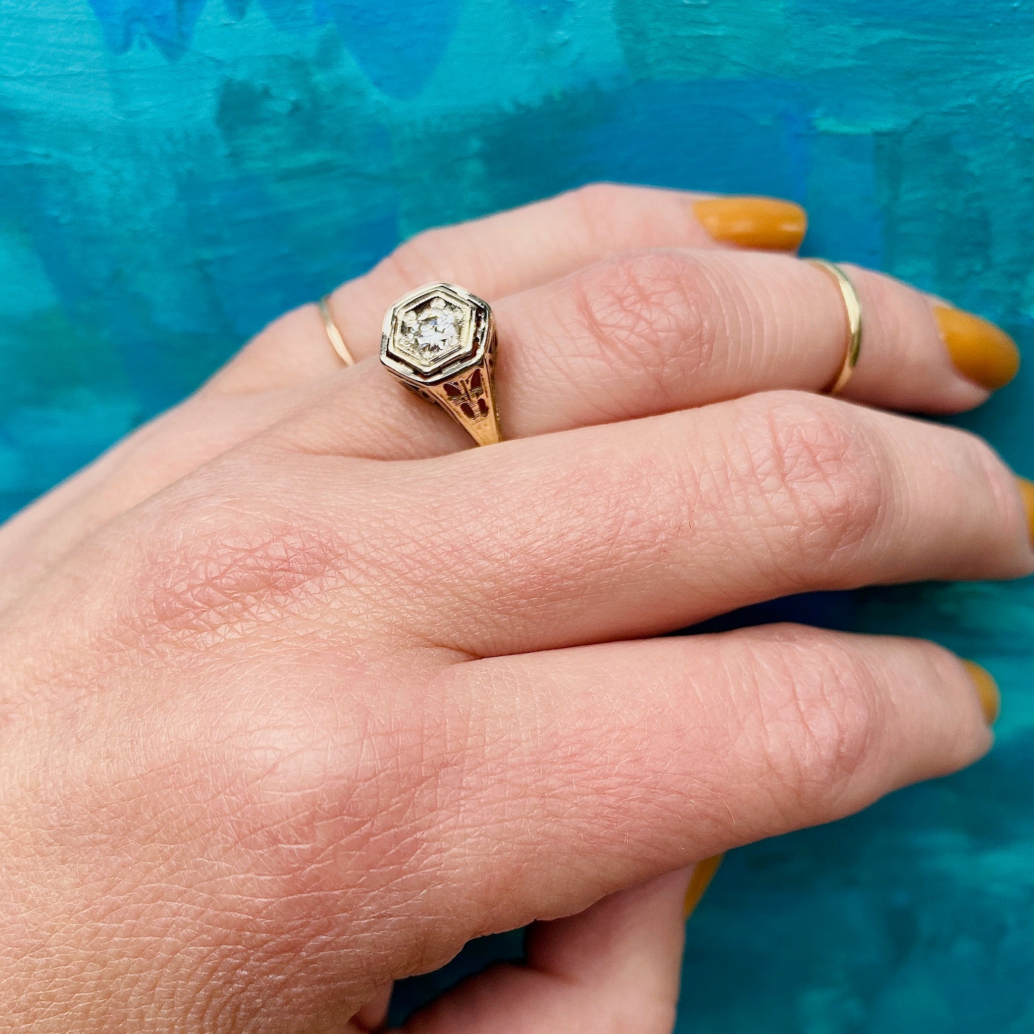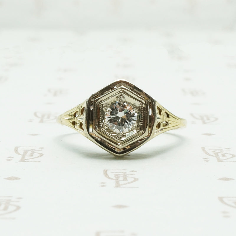 This Art Deco Filigree Ring is 14k yellow gold with a .30ct diamond set in white gold at the top. Dating from the 1920's and sparkly with lots of vintage detail. A two-tone Engagement ring is very versatile, allowing you to choose either a white or yellow gold wedding band.