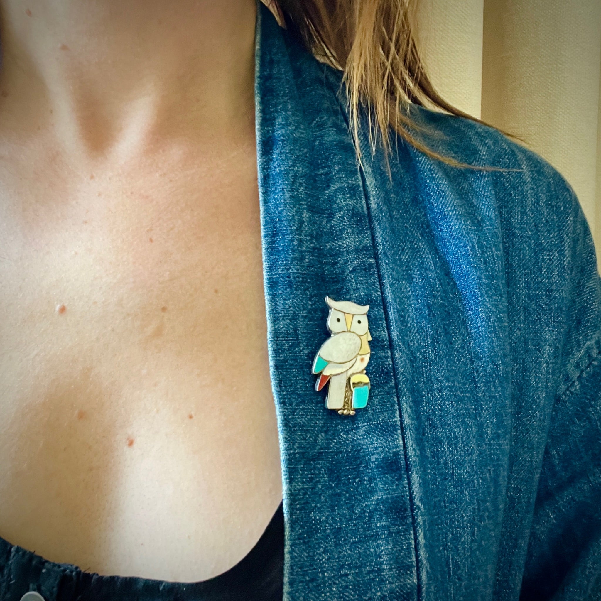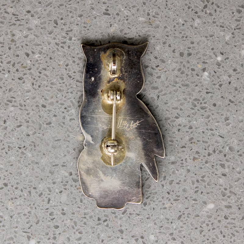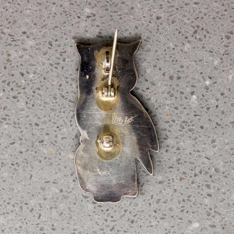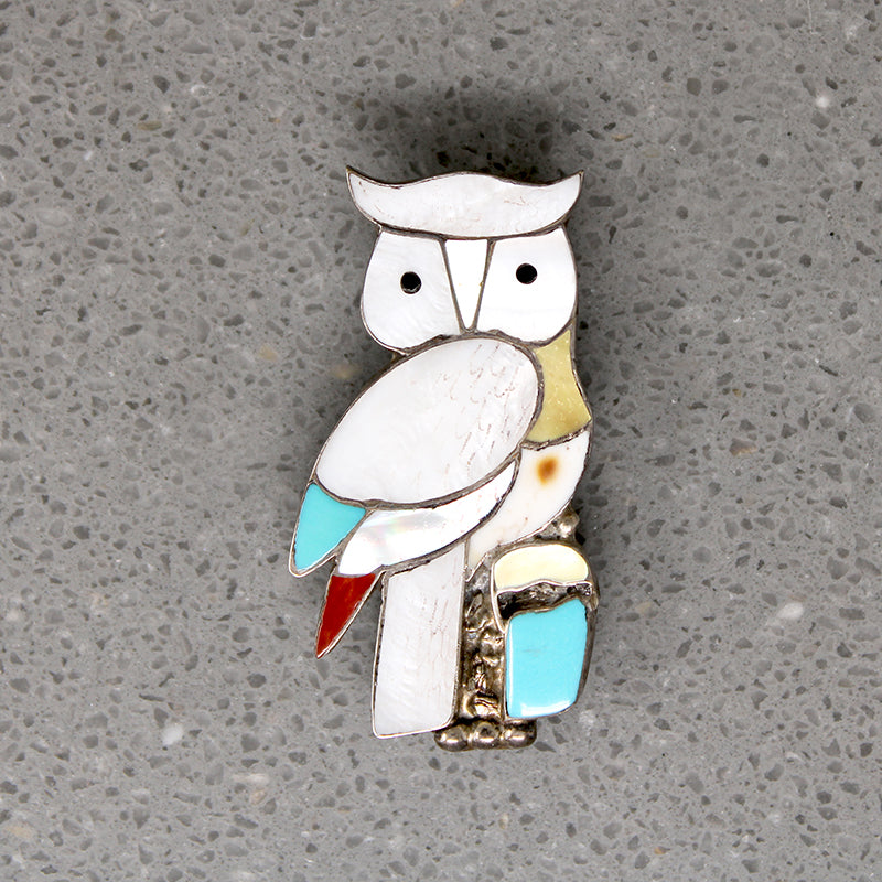 A great horned owl is rendered in wonderful white on white inlay with small colorful accents. This Zuni inlay brooch captures the owl's beauty in broad strokes. Mother of pearl, shell, and white agate is set in sterling silver. Her feathers are tipped in turquoise and coral, and she sits on a sterling tree branch. This brooch has both a pin and a bale, so it may also be worn as a pendant. The back of the piece is engraved "Zuni" and bears an illegible maker's mark. Circa 1970.
