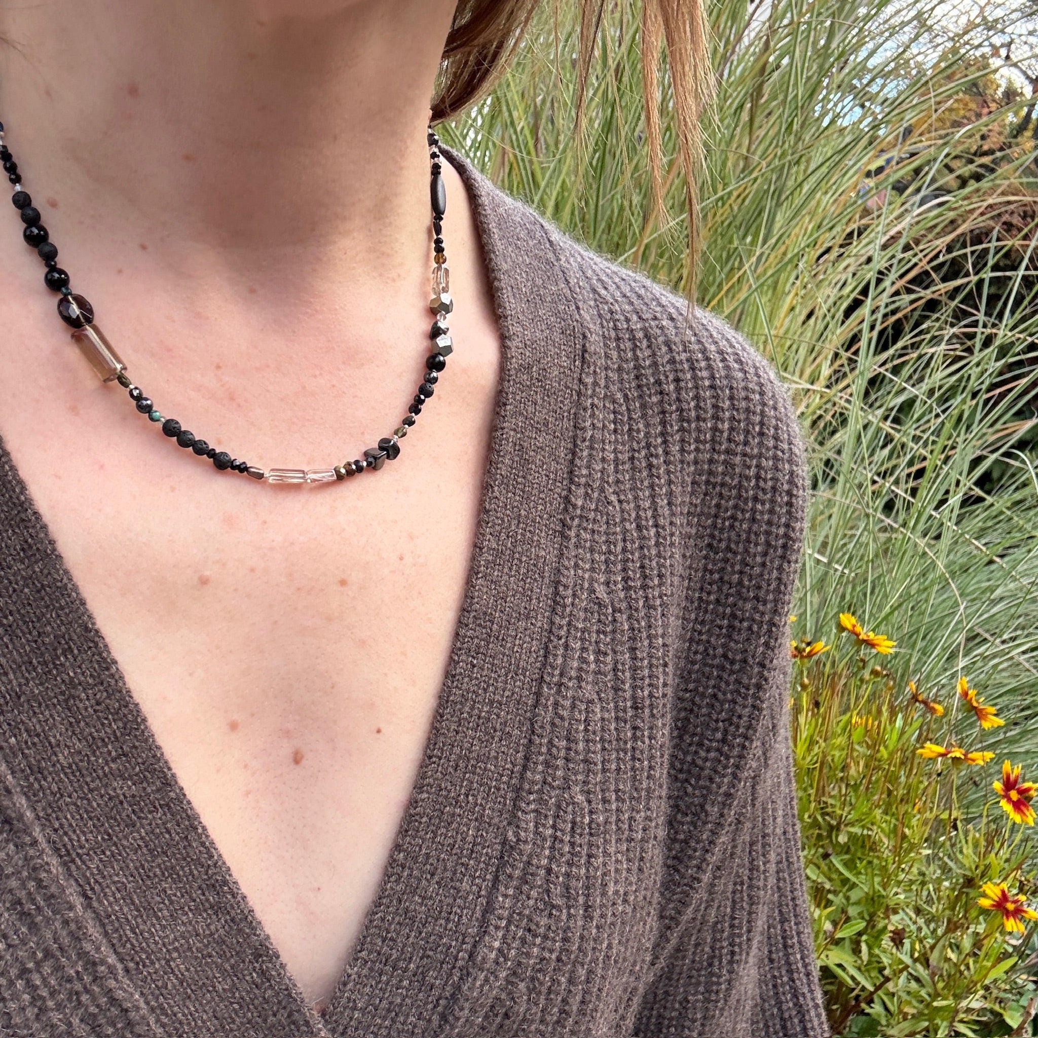 Chic gemstone beaded necklace in neutral tones of black, taupe, and grey from artisan Brin. The array of azurite, black garnet, blue tourmaline, chrysocolla, hematite, labradorite, lava, moonstone, multi-sapphire, onyx, pearl, quartz, phantom quartz, sapphire, smokey quartz, turquoise, and wooden beads vary in shape; the somber hues are accented by small pops of bright blue to lighten the mood. The beads are hand knotted on silk and displayed on an adjustable gold filled curb chain. A sophisticated necklace to layer with your favorite chains, or add a pendant to its spring ring clasp.