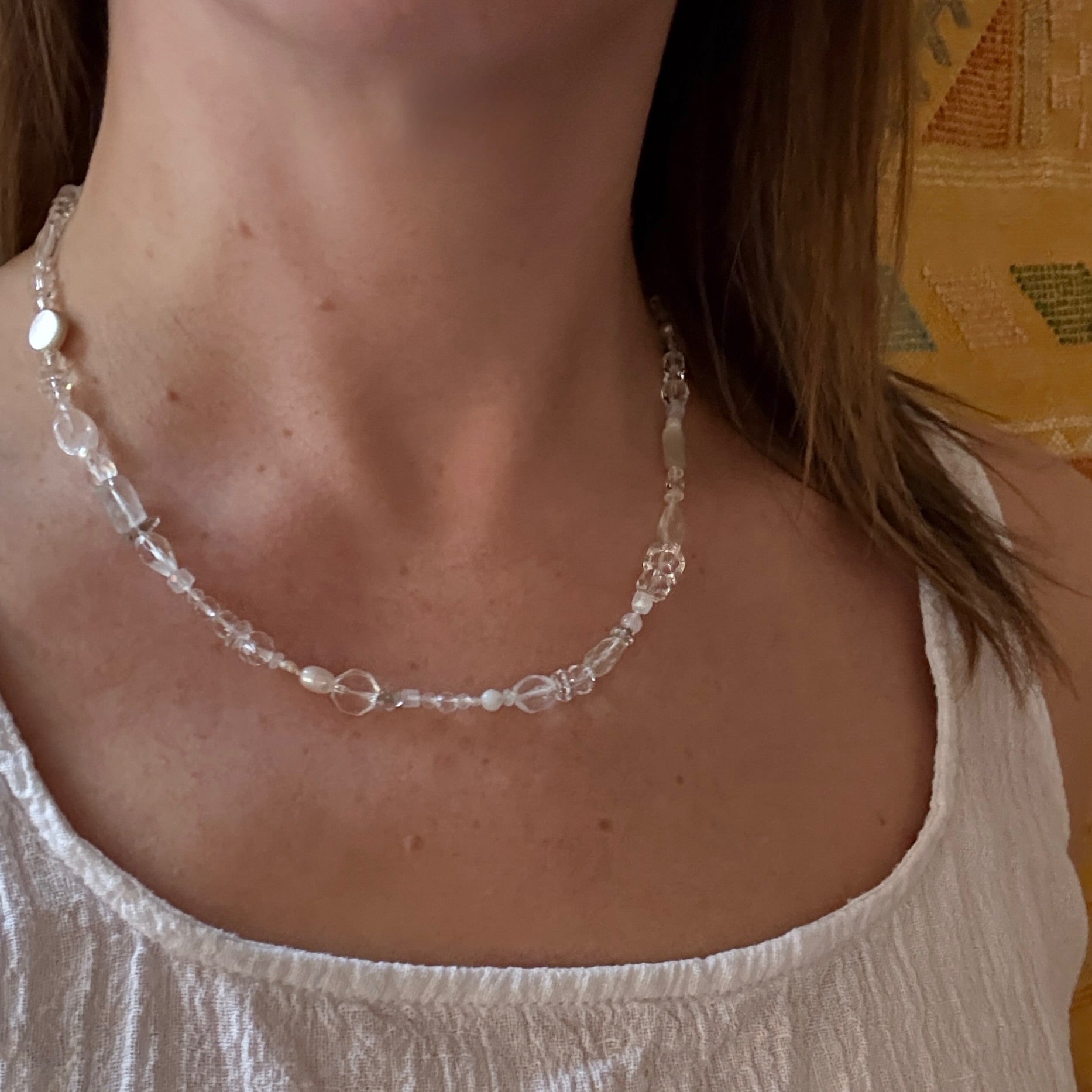 An ensemble of frosty gemstone beads glitter and glow on this ethereal artisan necklace from Brin. Pale grey banded agate, clear quartz, fluorite, labradorite, misty moonstone, iridescent mother of pearl, phantom quartz, glossy pearl, pastel rose quartz, and cleansing selenite beads in a variety of dainty shapes are hand knotted on silk and suspended on an adjustable sterling silver curb chain. Dreamy, romantic, and so very versatile; pair these beads with your favorite chains, hang a pretty pendant from its spring ring clasp.