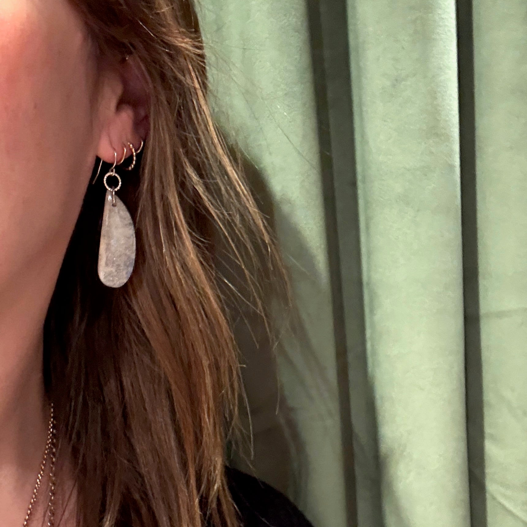 Just in time for the Holidays, Brin, an in-house artisan favorite, has launched a new collection of gorgeous earrings featuring unique stones and recycled metals. Large asymmetric drops of magical moonstone shimmer with subtle blue adularescence. The stones are suspended on sterling silver rings. The decorative element hangs on recycled sterling silver French ear wires.