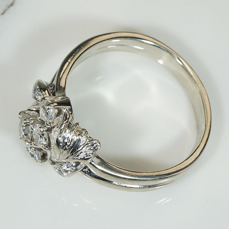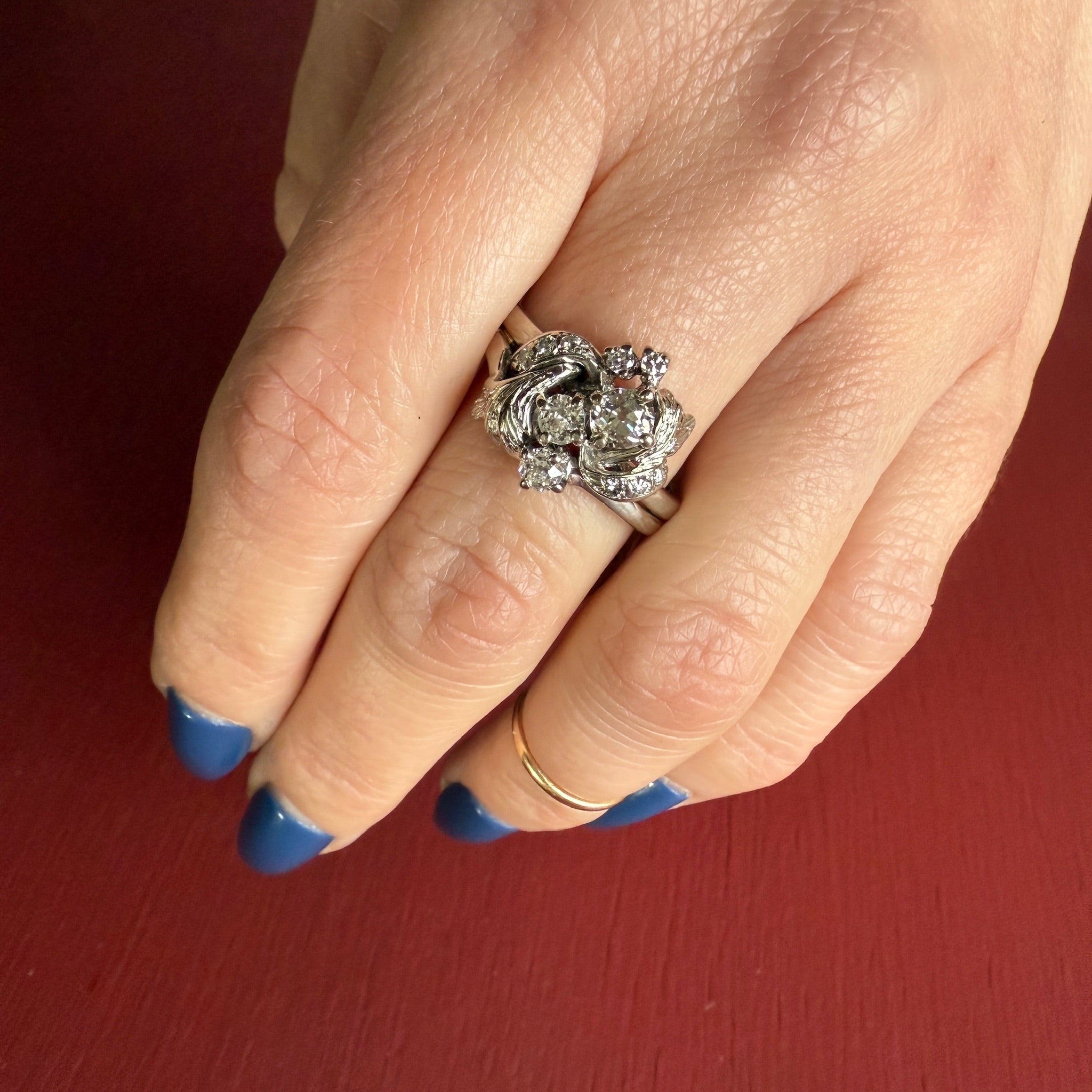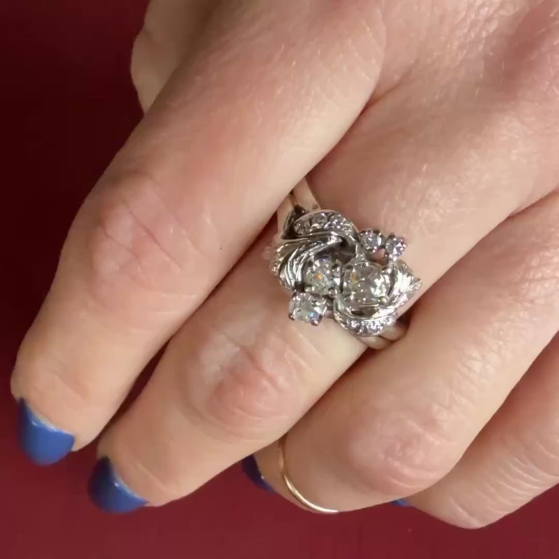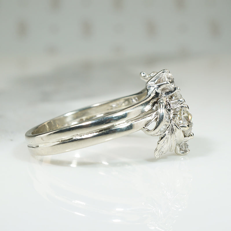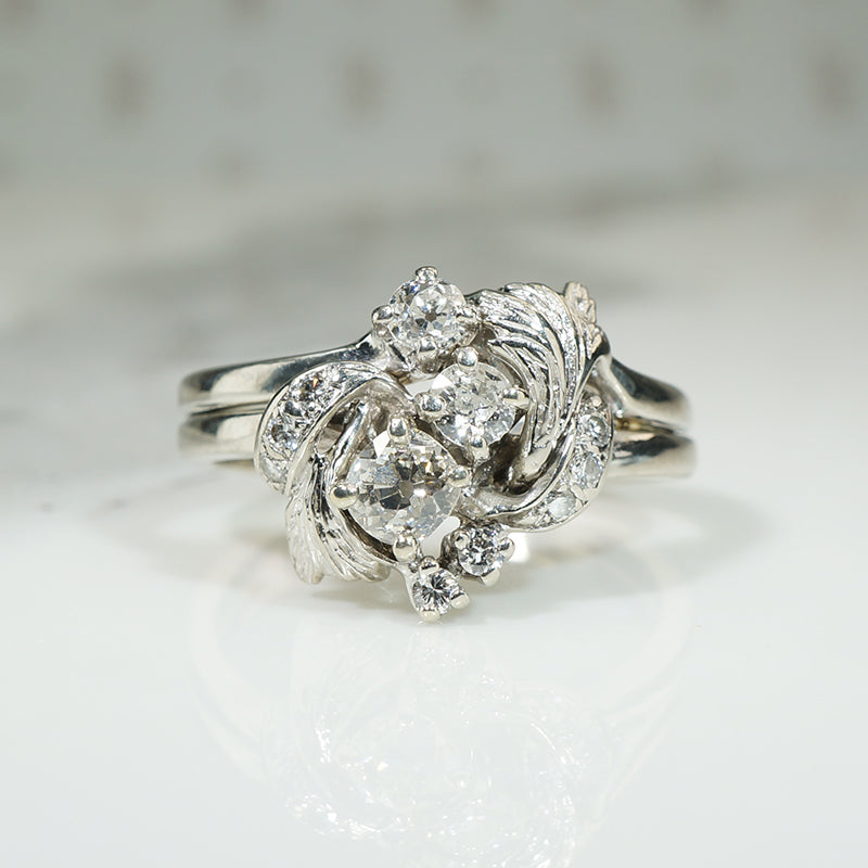 A trio of old mine cut diamonds wander across the front of this lovely 1930s engagement ring. There are a scattering of smaller diamonds among the white gold leaves twinkling like dew drops. This is such a lovely example of the romantic jewels of the 1930s. 14k white gold, .90tcw of diamonds.