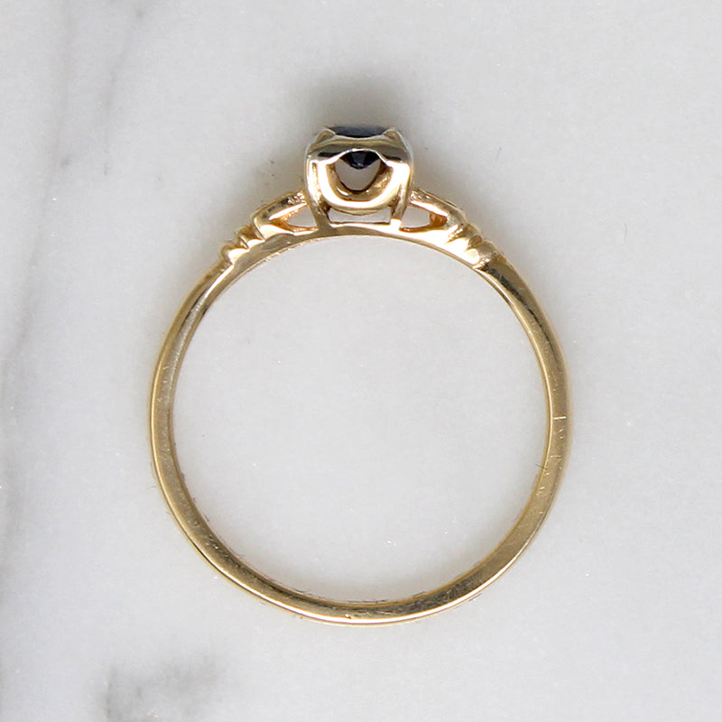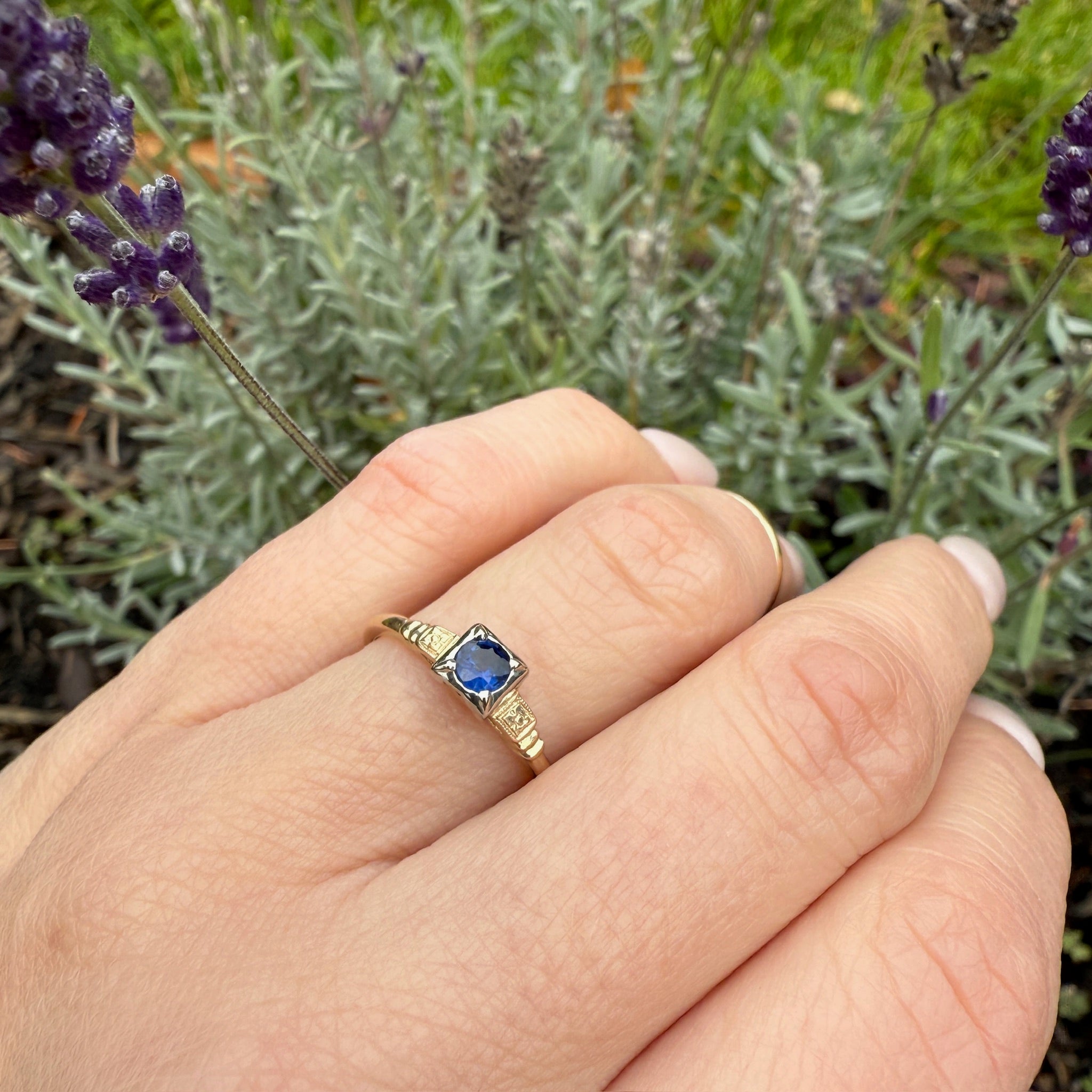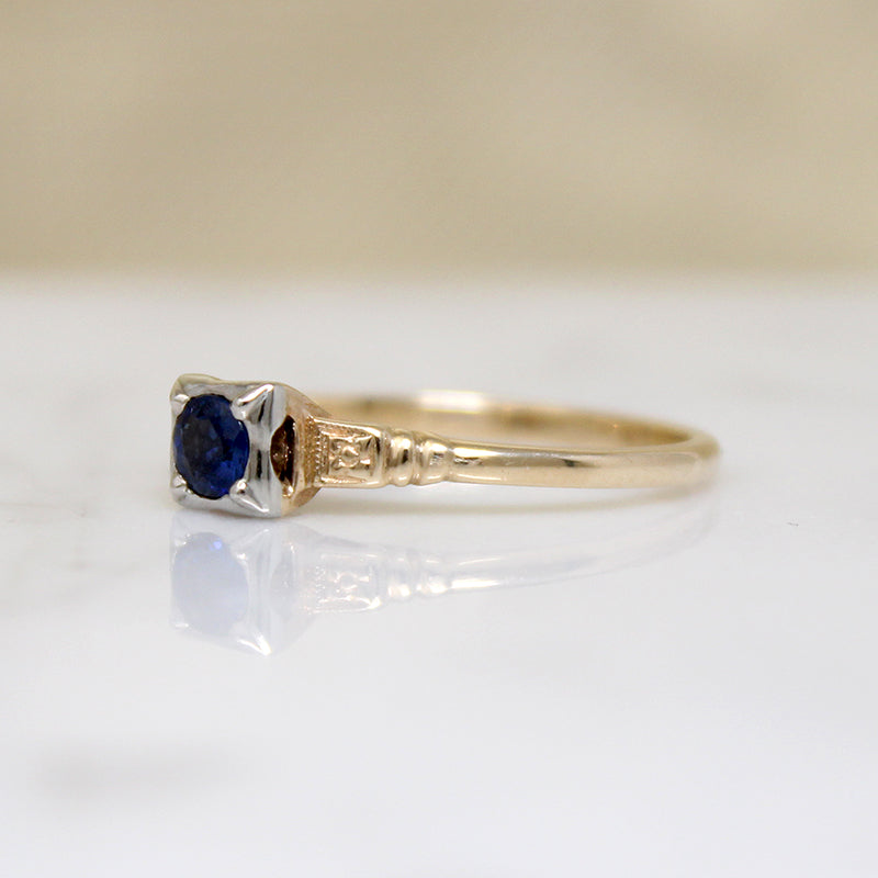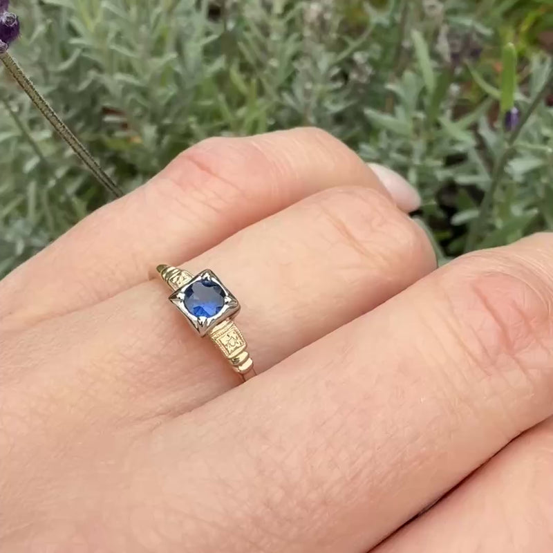 A moody blue sapphire is the star of this graceful two-tone 14k gold engagement ring. The .25ct natural sapphire sits in a square white gold head with four sleek prongs. The gemstone is raised above yellow gold shoulders engraved with dainty forget-me-not flowers. Low profile cathedral shoulders taper into a slender band. The pretty blue sapphire and the sweet floral engraving gives this ring its undeniable vintage romance. Circa 1940.