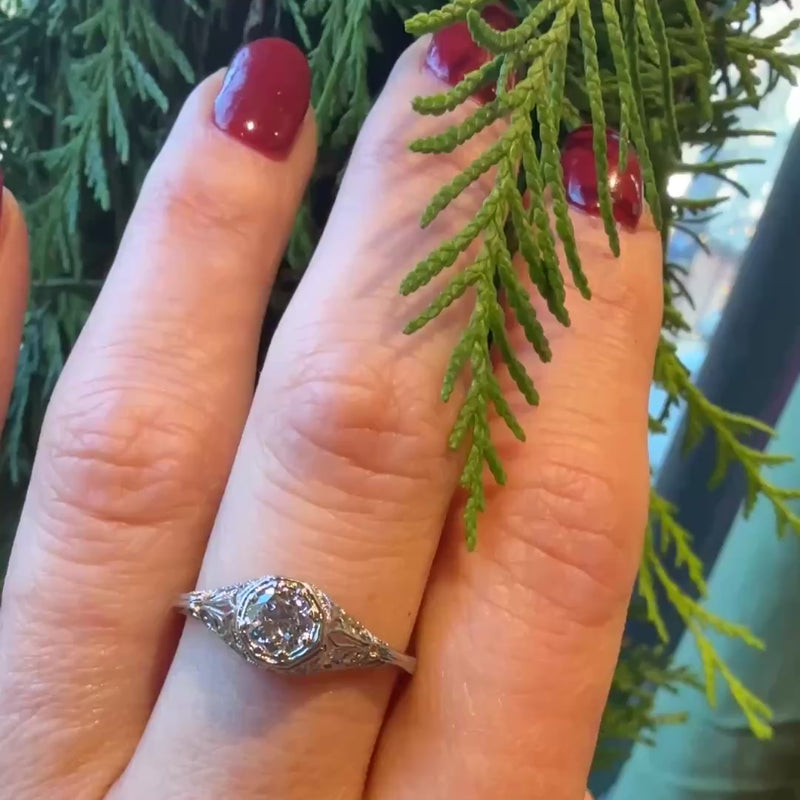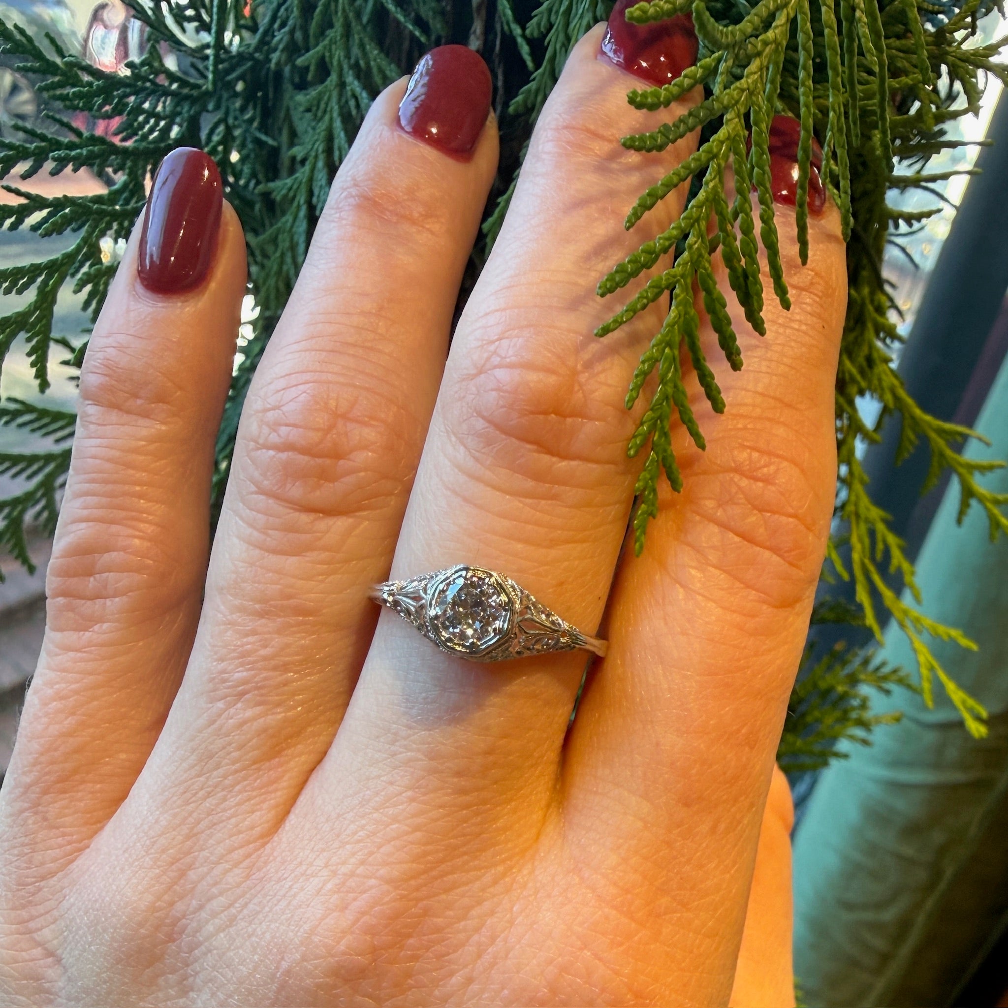 Fabulous Art Deco 14k white gold ring set with a .42ct old european cut diamond. The filigree work on this ring is so detailed and lovely and the diamond sparkles fabulously. Circa 1920.