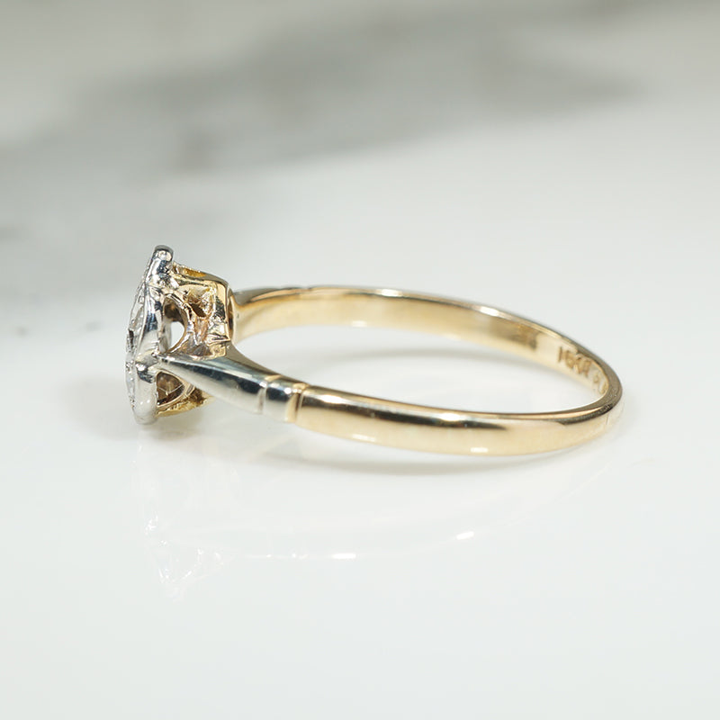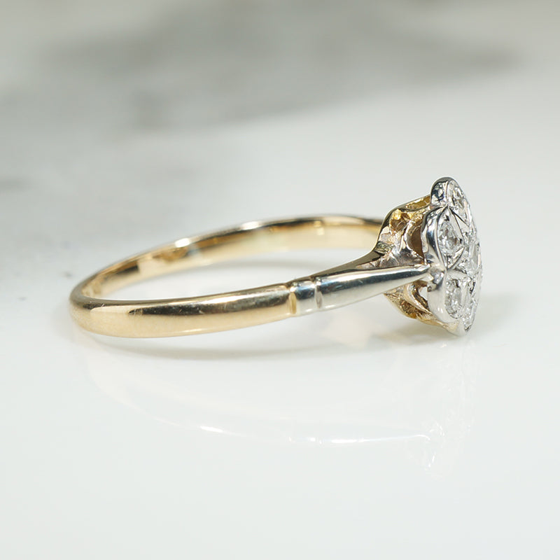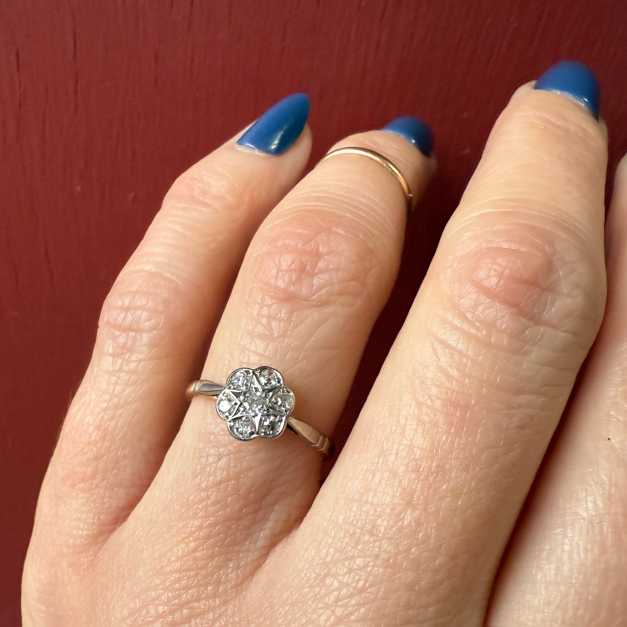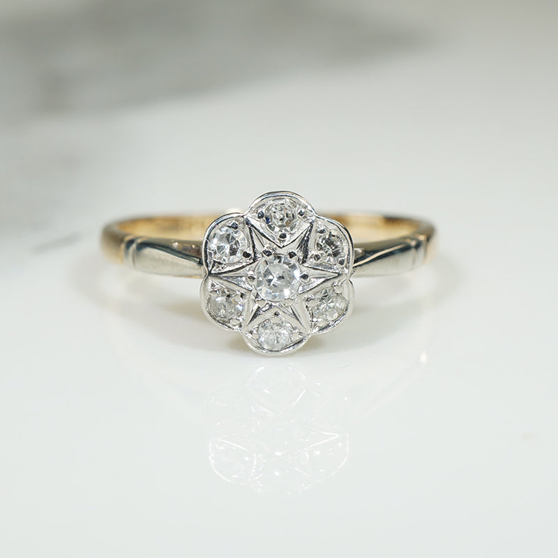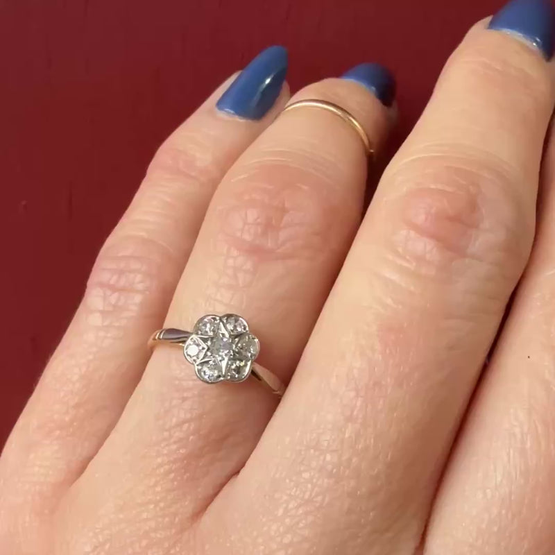 This pretty and petite ring is made of platinum topped 15k. The top of the ring is set with six small diamonds in the shape of a flower while the center diamond is set in a star with its points reaching to the edges between the other diamonds, an enchanting design. The shoulders of the ring are also platinum. Circa 1920.