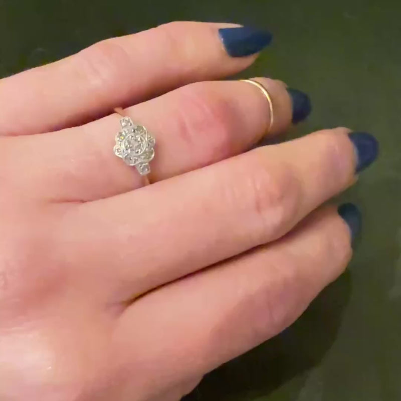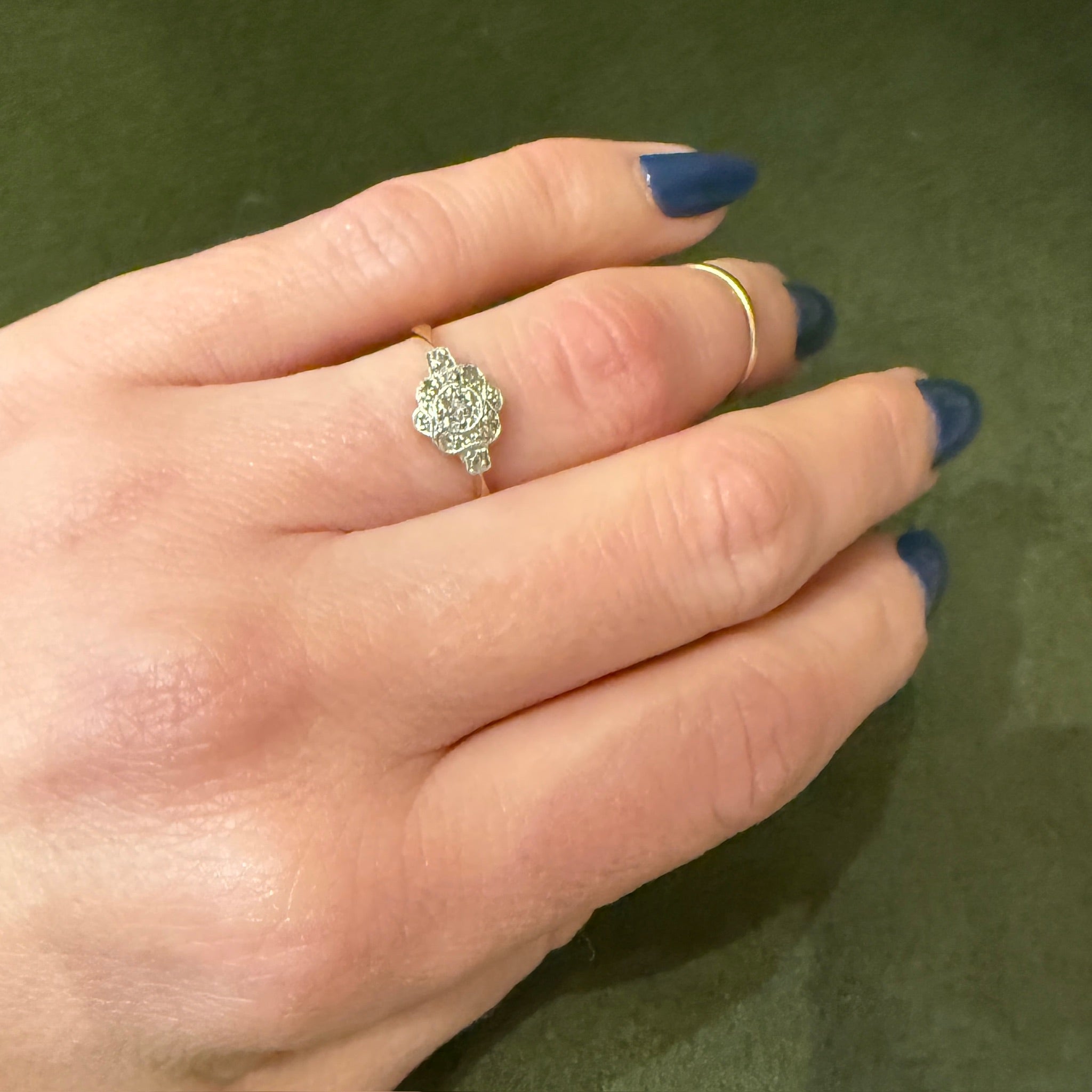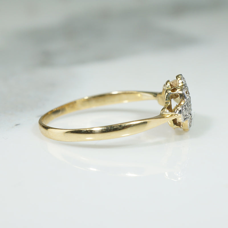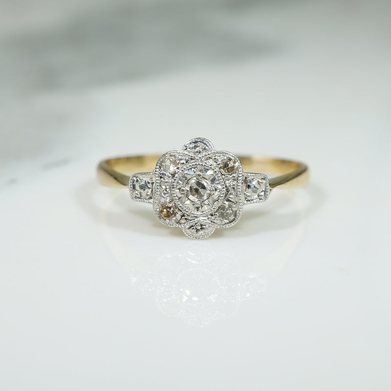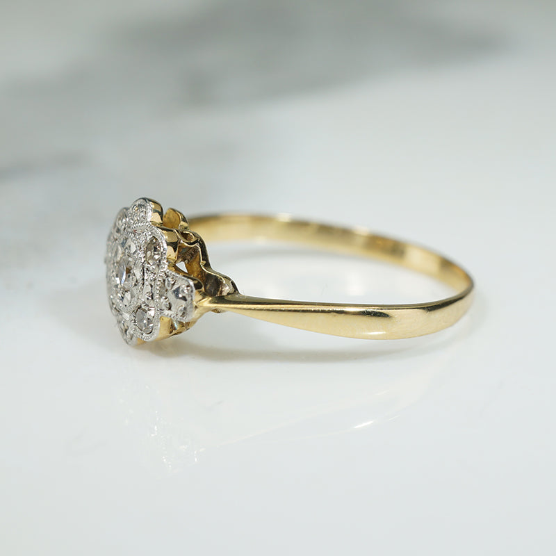 The technique of layering diamond-spangled platinum over 18ct yellow gold we see in English rings of this style is so luxurious. This cheerful Edwardian cluster ring resembles a daisy-like flower. The cluster of diamonds sparkles and shines in platinum settings, with delicate milgrain engraving surrounding the stones. The decorative top is layered over the 18ct gold body of the ring, with a pretty low profile gallery, graceful pinched shoulders, and a slender band. Romantic yet practical, this sweet piece will make a darling commitment ring. Circa 1910.
