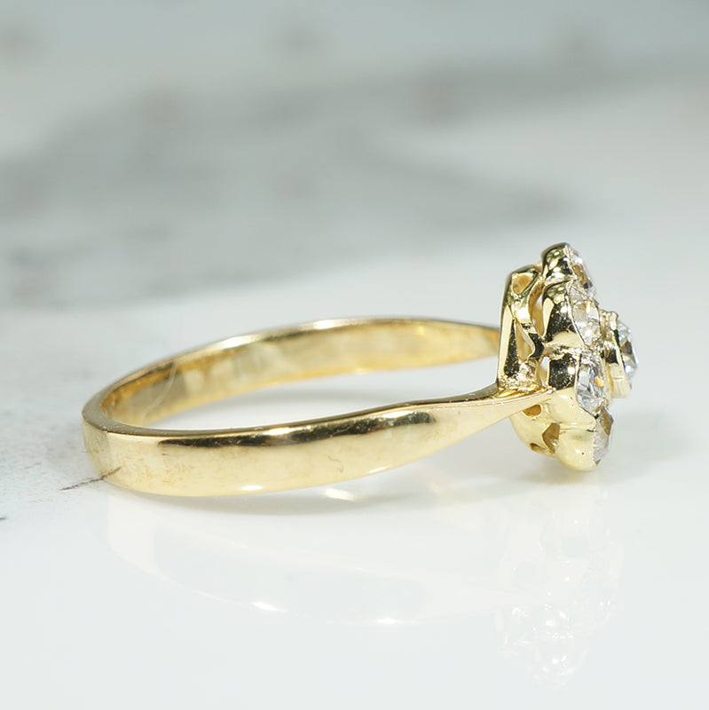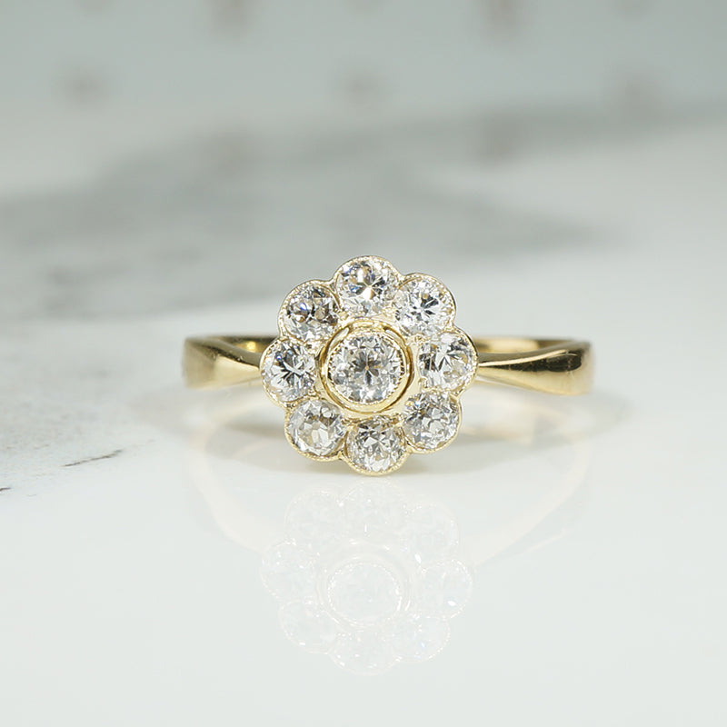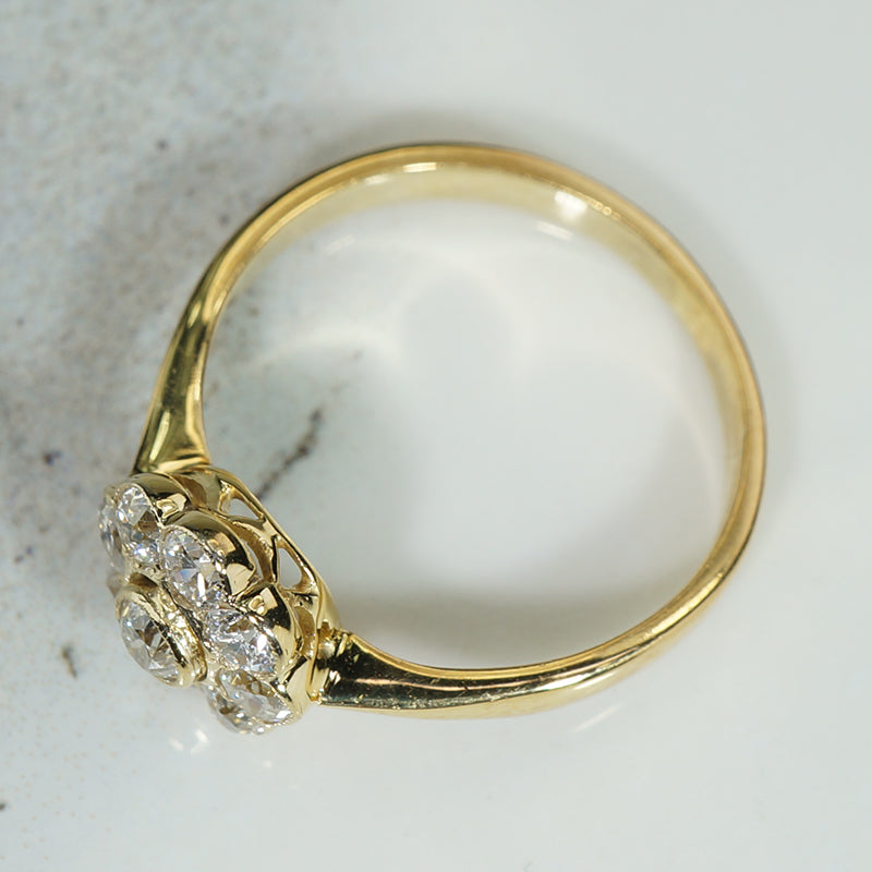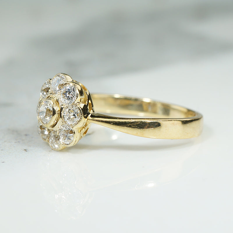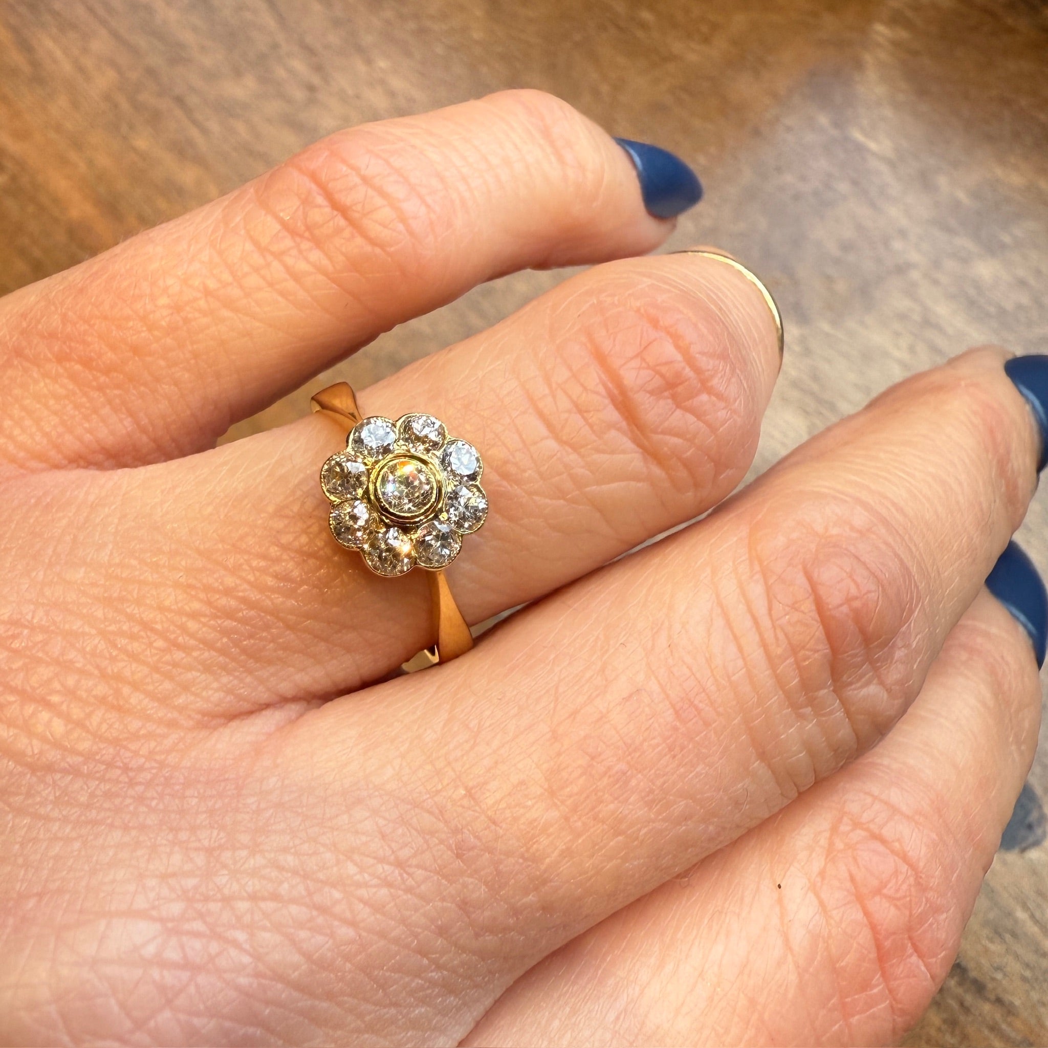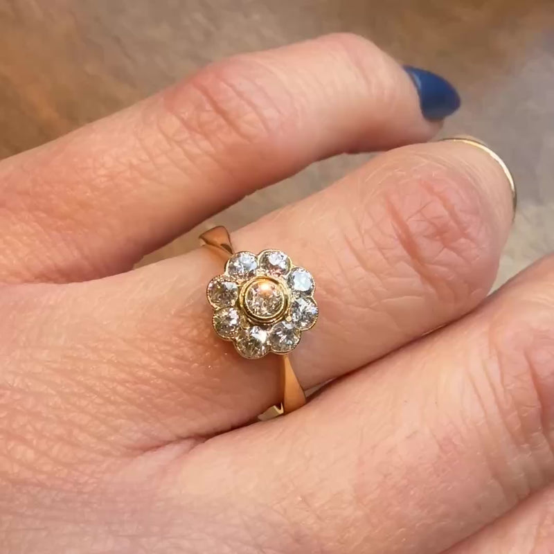 The rich color of the 18k yellow gold is well matched with the brilliantly beautiful diamonds. Bezel set in the center is an old mine cut diamond, it is surrounded by eight more diamonds in a mix of old Mine cuts and old European cuts. The diamonds are all bright and sparkling and have a total weight of apprx. ,65cts. Circa 1915.