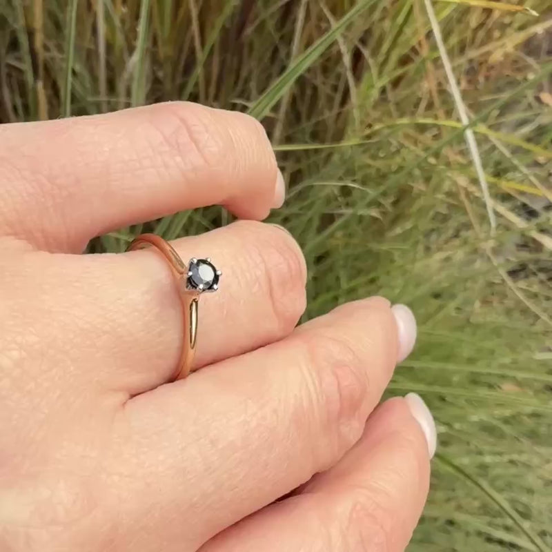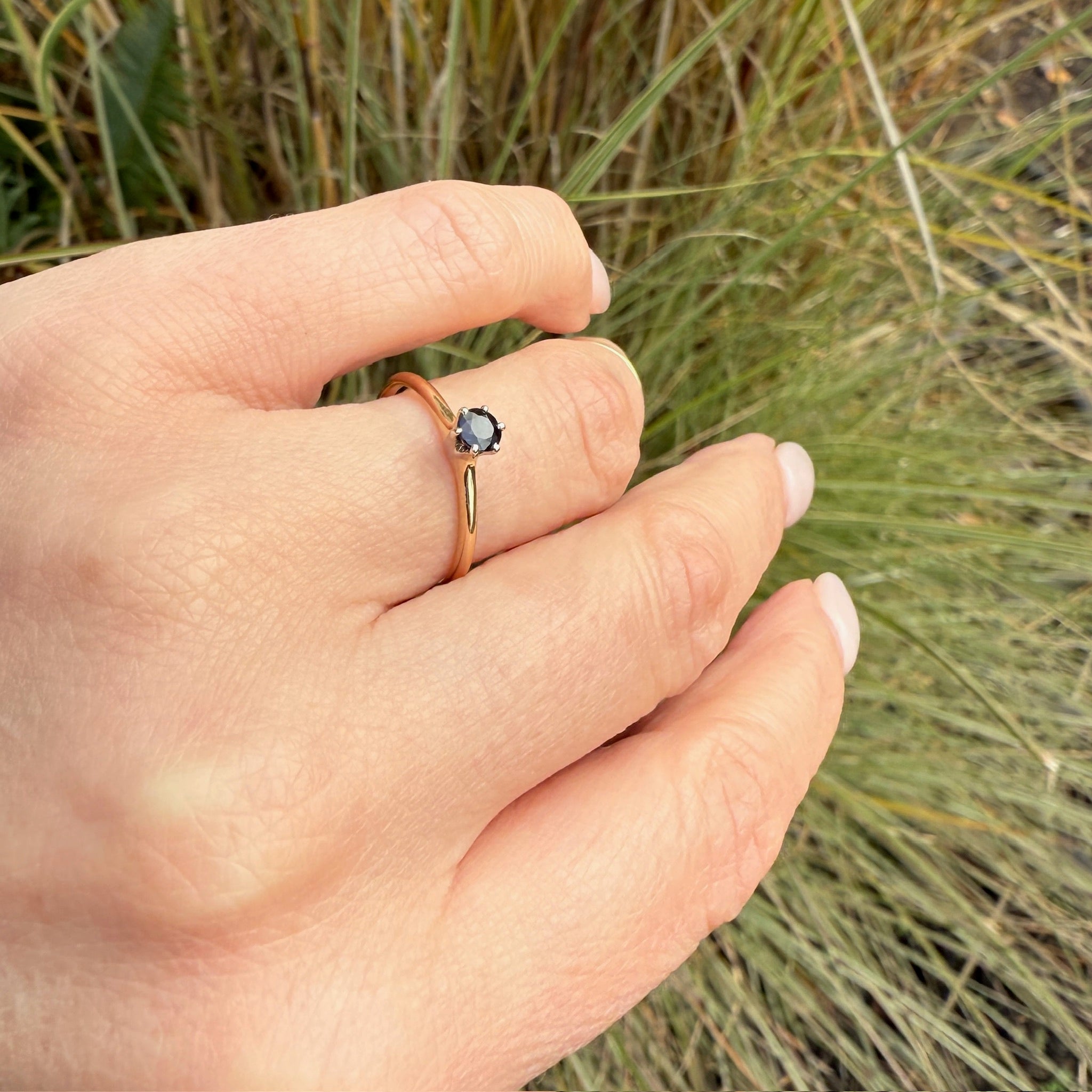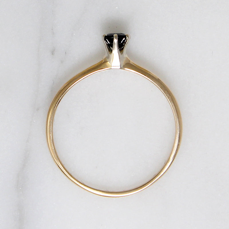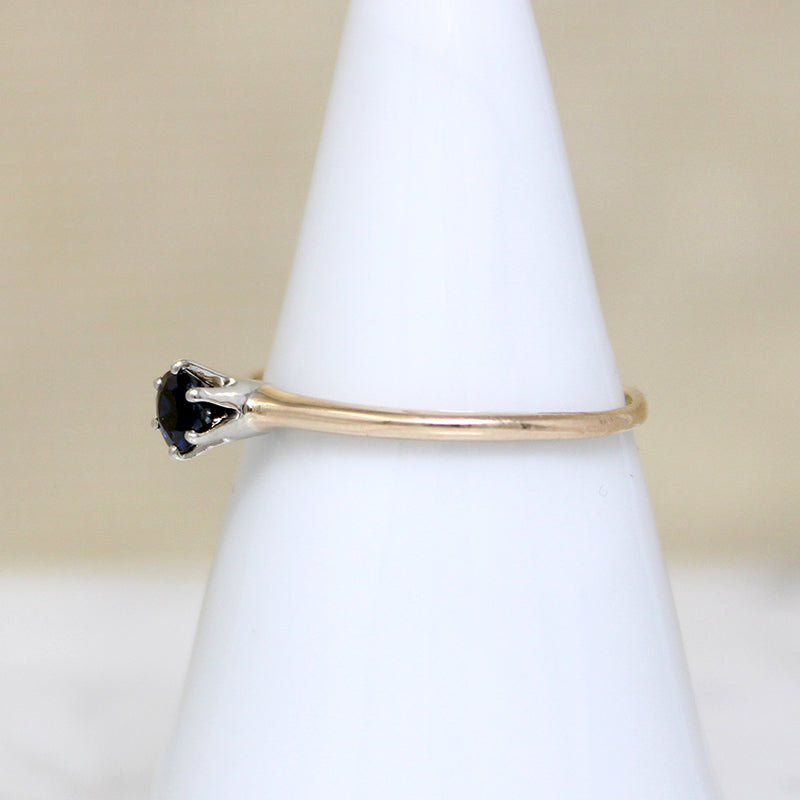 A velvety blue sapphire in a classic solitaire engagement ring. The .30ct round sapphire is set in a six-prong white gold head, raised proudly over the 14k yellow gold body of the ring. This piece is quite dainty, with a slender shoulders that taper gently into a 1mm band. This engagement ring is a wonderful choice for a lover of colored gemstones. Circa 1940.
