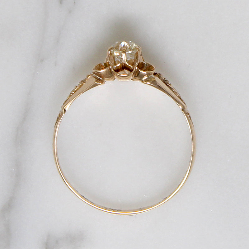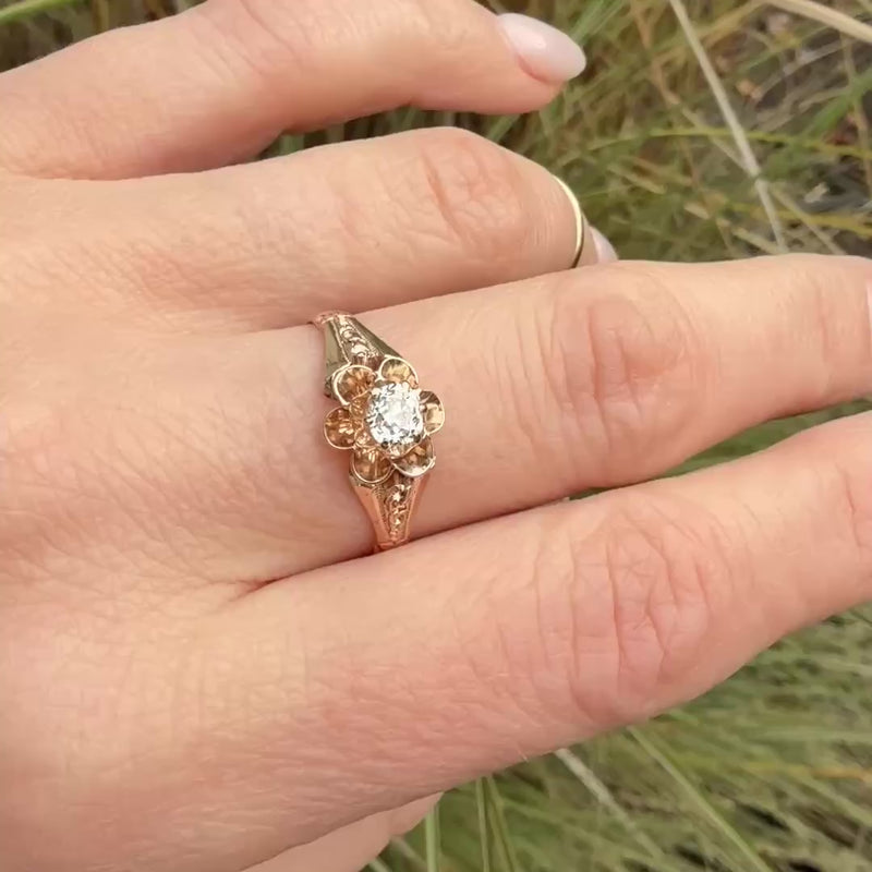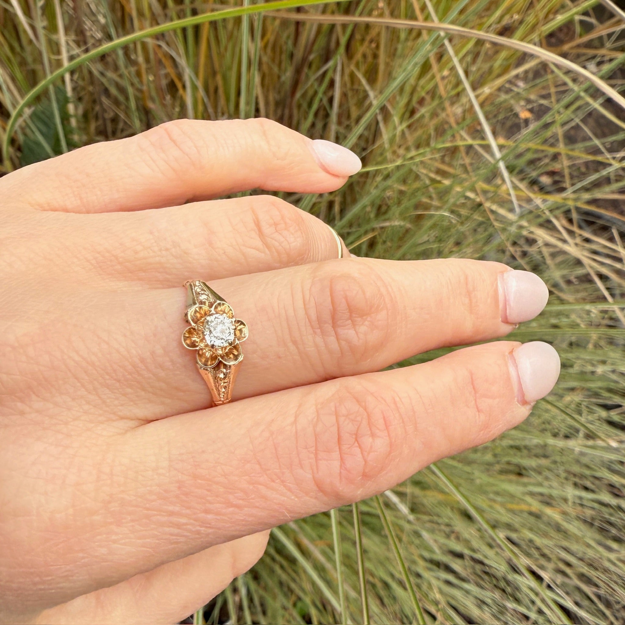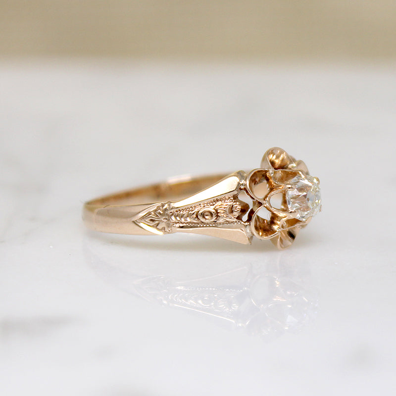 A romantic Victorian engagement ring with an old mine cut diamond framed in rosy 14k gold petals. The gorgeous .39ct stone has an SI clarity and L color, with a chunky crown, open culet, and brilliant sparkle. It is displayed in the classic buttercup style, held by six prongs within a fluted, petal-like head. Flared shoulders are deeply engraved with a floral motif. This decorative element tapers into a slim band. The interior of the band is engraved with the initials "AU." This ring has so much charm and character, and it's a generous, 21st Century person's size. Circa 1880.
