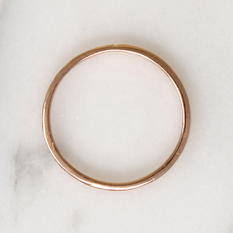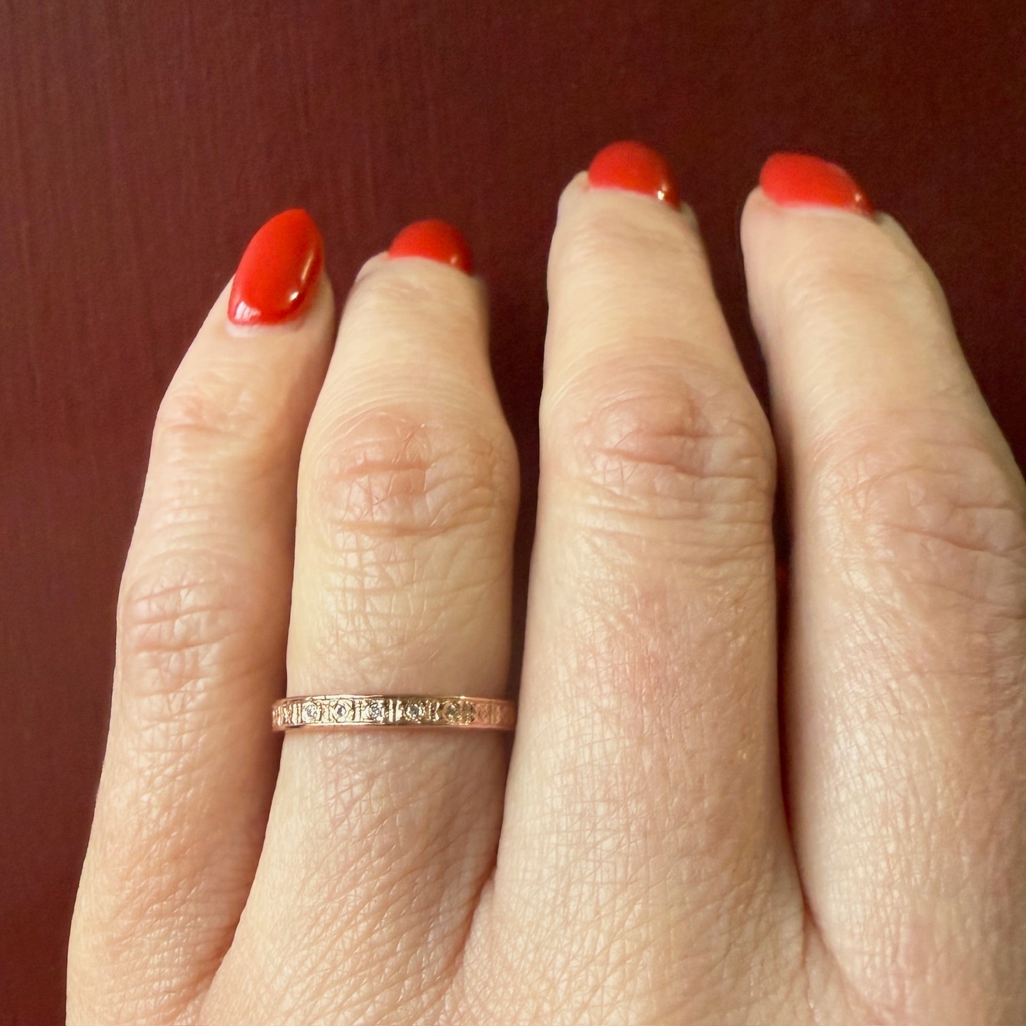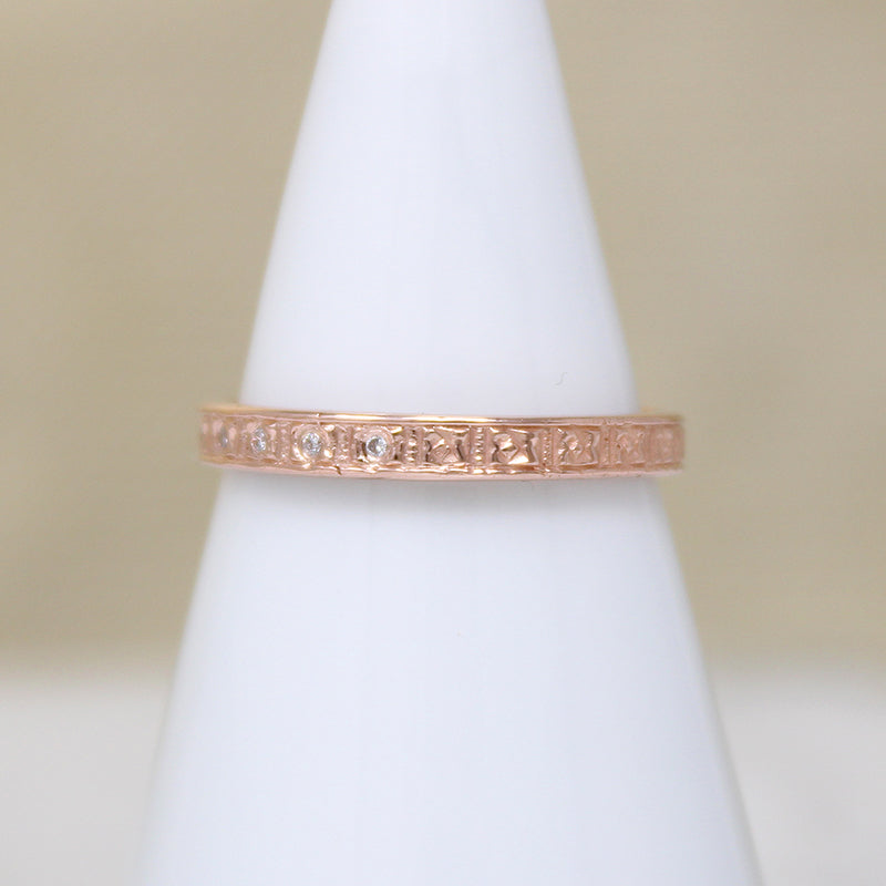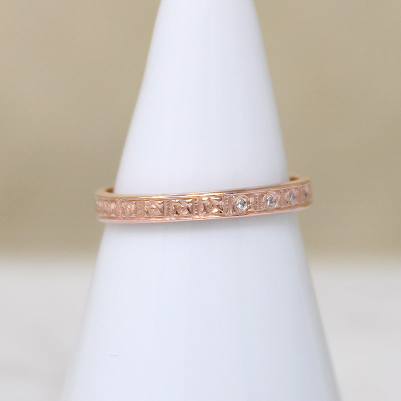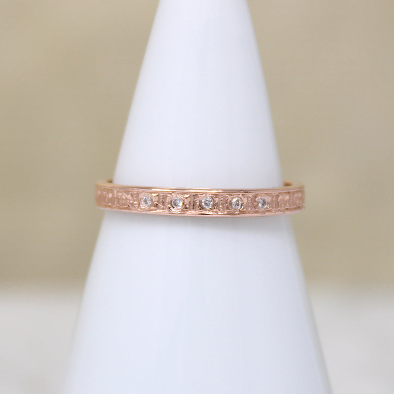 A ring of engraved flowers girds this dainty 14k rose gold band, and five tiny vintage diamonds sparkle across its top. On each edge is a smooth, slightly raised ridge, making it great for stacking. Thoughtfully crafted in the classic Art Deco style.