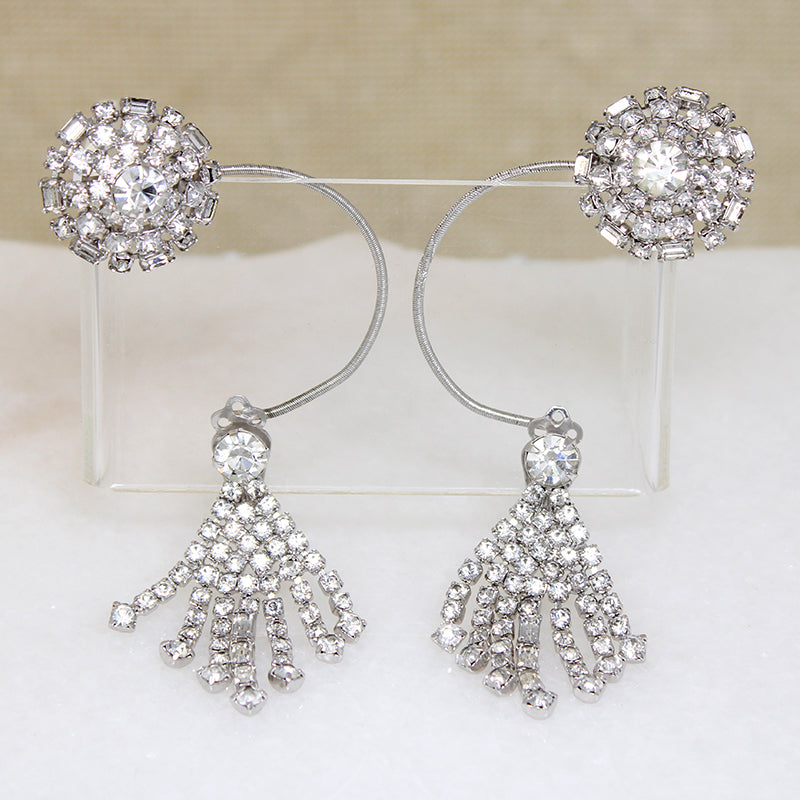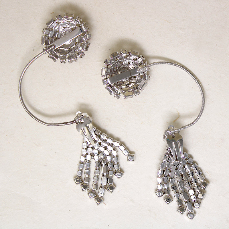 Fireworks! These rhinestone ear cuffs flare and fall like a pyrotechnic display. Fringes of round and emerald-cut crystals cascade from a pair of clip-on earrings. Bursts of rhinestones sparkle at the temples, displayed on stiff springs that curl over the ears. This interesting design is beautifully crafted, the rhinestones are prong-set in bright white silver-tone metal. Circa 1960.