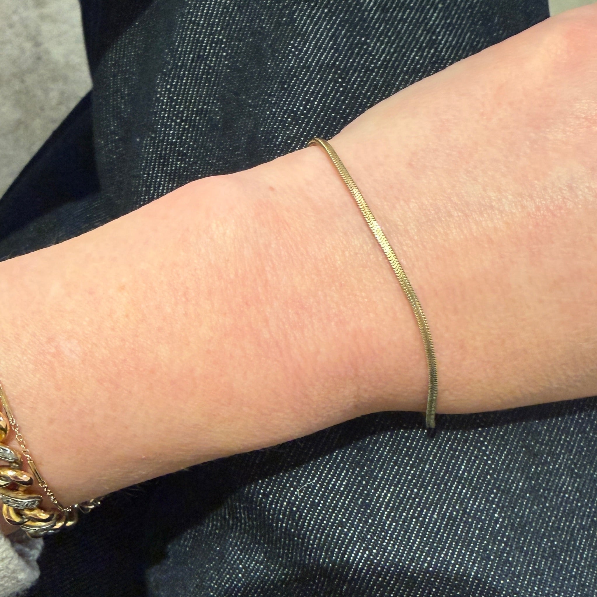 This gold filled snake chain bracelet is just the thing for adding a little glitter to your day. The woven links are sinuous and supple. A classic piece that fastens with a spring ring clasp. Circa 1950.