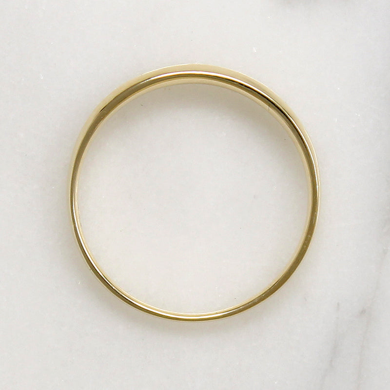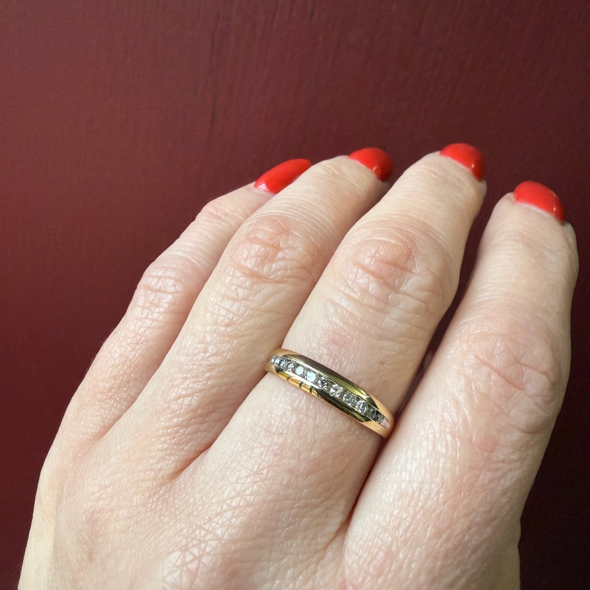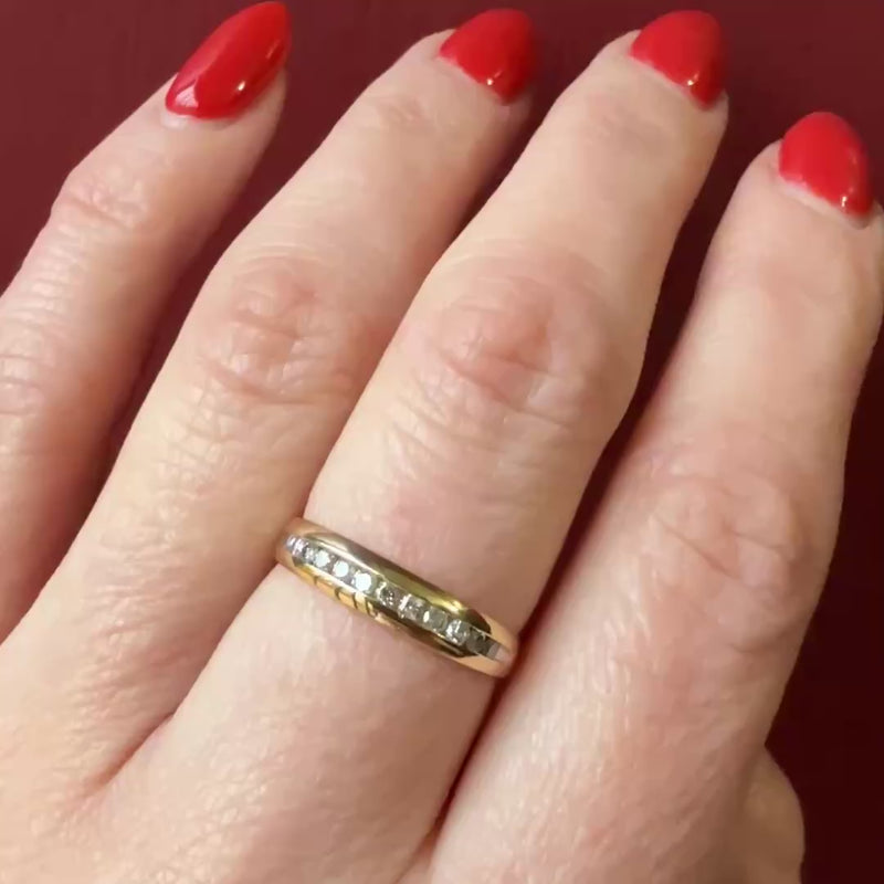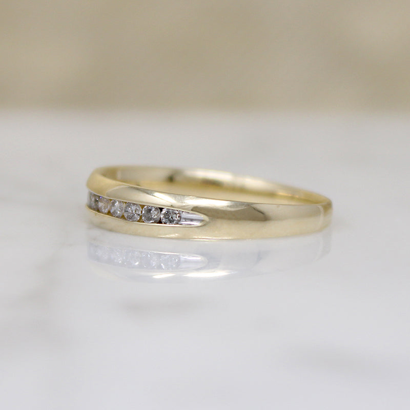 This tapered 10k gold band is channel set with a row of sparkling diamonds. One dozen diamonds with an .25tcw add glamour to this sleek and stylish ring. This versatile piece looks great worn alone or in a stack. Circa 1970.
