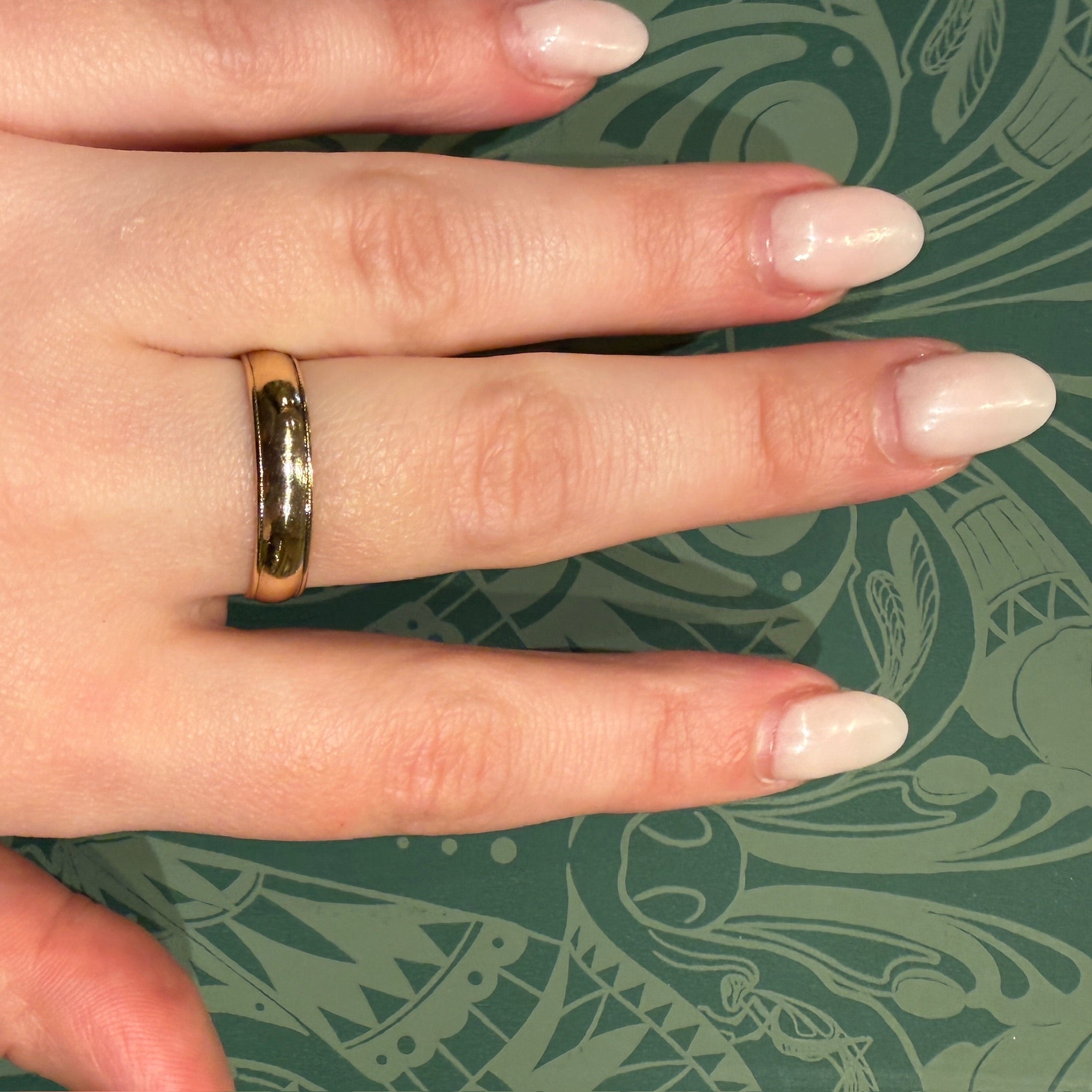 Details.....Currently a size 10.5. The band measures 4.8mm wide. In Very Good Vintage Condition. You should always expect some wear on vintage and antique pieces; we consider it part of the charm.