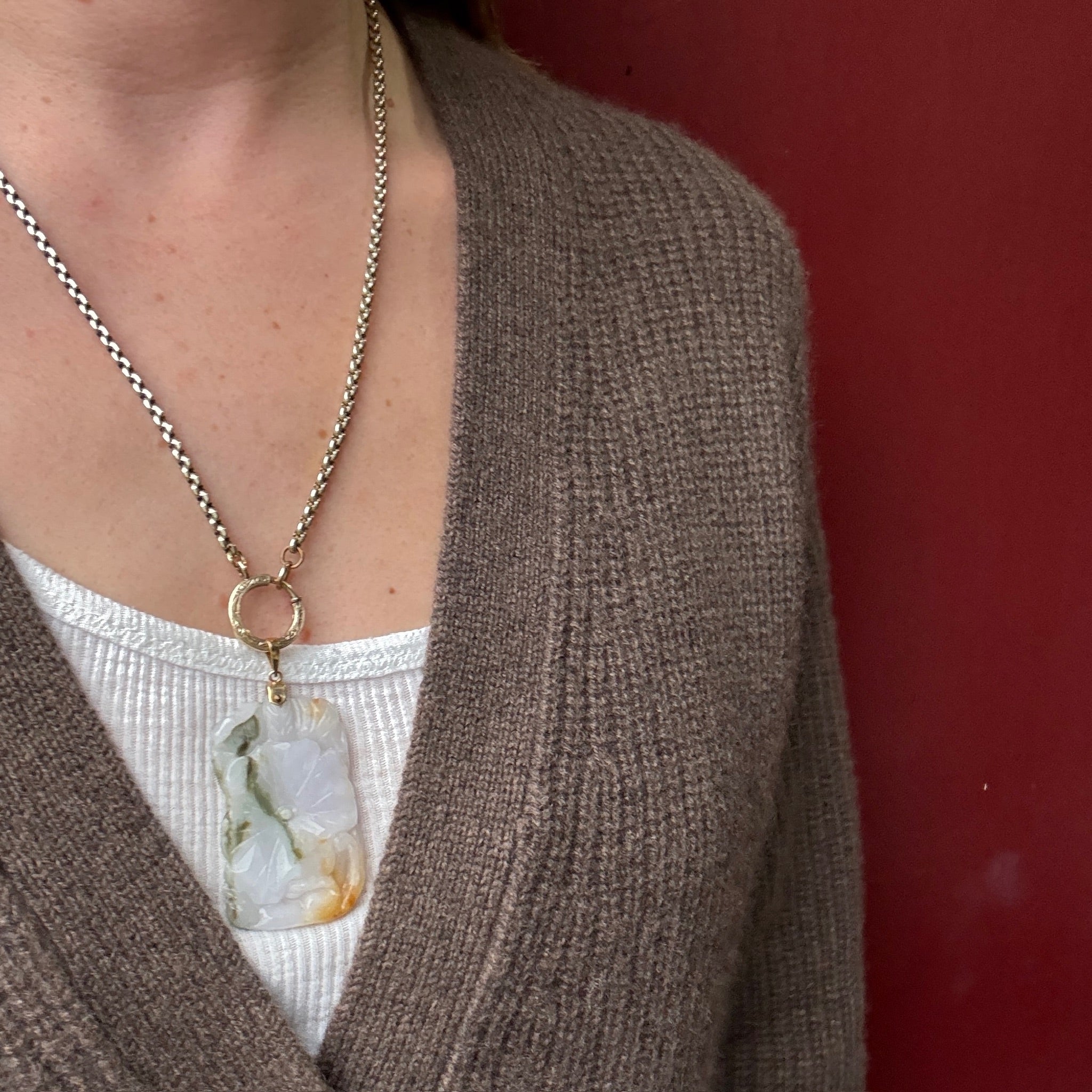 This multi hued jade carving features a Lotus in its various stages of growth, there is a bat with its wings spread at the very top of the pendant in a protective position as if holding the good fortune in the pendant itself. The Lotus represents rebirth and spiritual enlightenment, bats represent good fortune, prosperity and happiness. The carving is topped with a decorative 14k gold bale. Circa 1950.