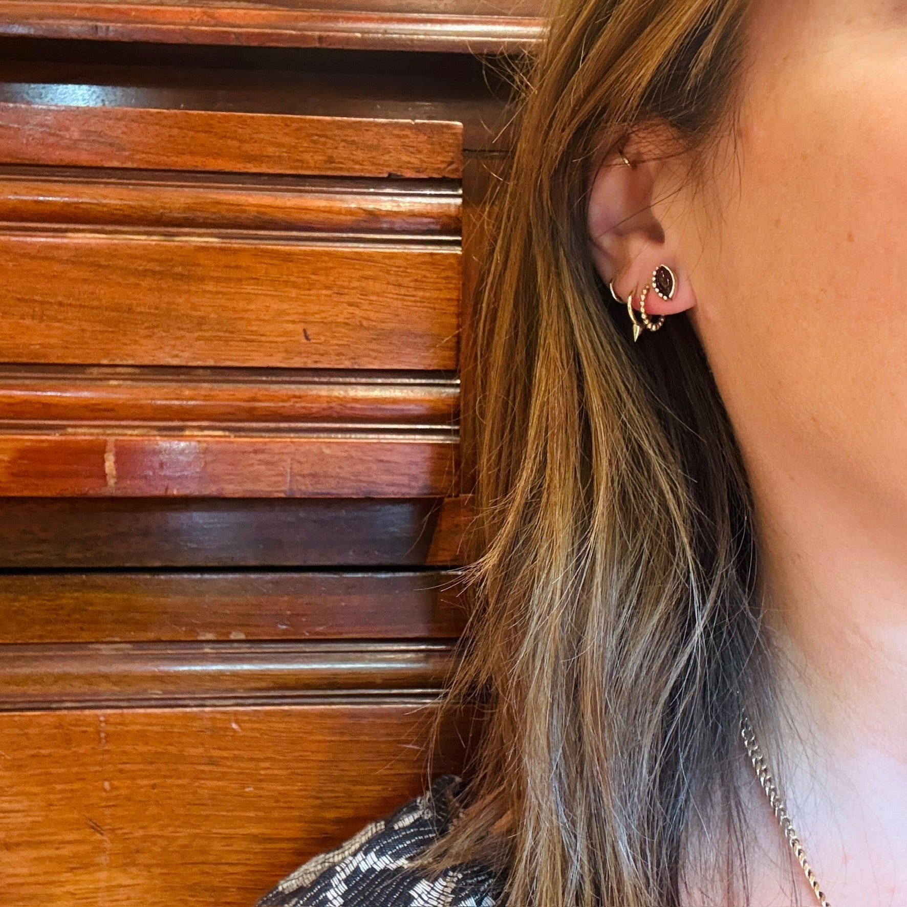 Rich red garnet is set in these little recycled sterling silver stud earrings. Each stud is a silver navette, set with a glossy, lozenge-shaped garnet gemstone. Tiny silver beads curve along one side of the studs' bezels. These artisan earrings are ideal for daily wear, and a nice shape for a second piercing.