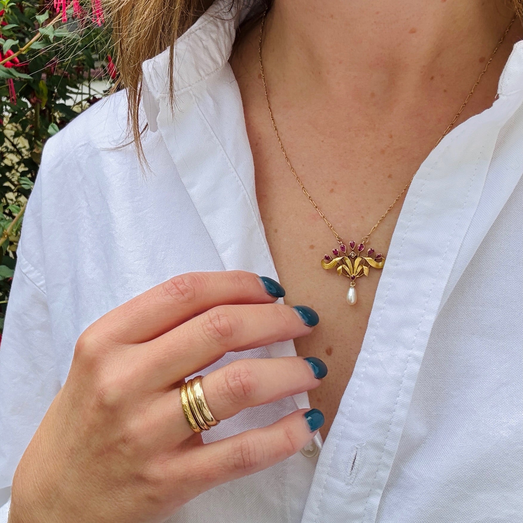 Delightful French Art Nouveau Ruby & Pearl Necklace