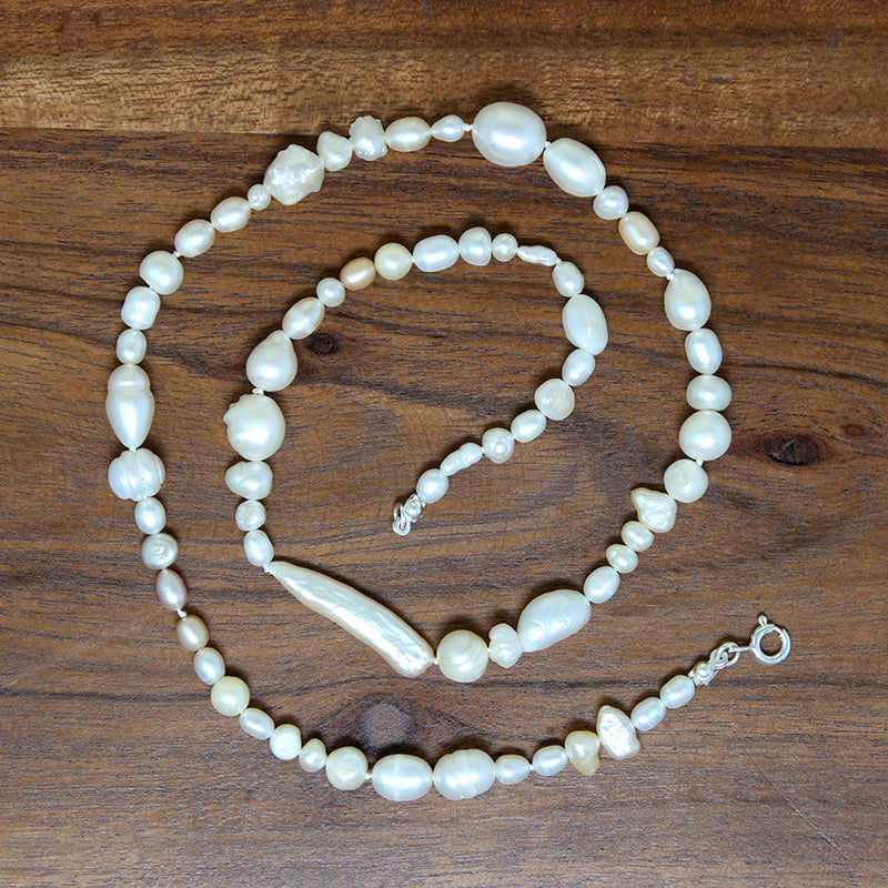An inspired new take on the classic strand of pearls. Cultured and freshwater pearls in a variety of sizes are hand knotted on white silk. The cultured pearls are perfect glowing orbs, the freshwater pearls have a variety of wonderful baroque shapes and a silken texture; the combination feels fresh and romantic. Finished with a sterling silver spring ring clasp. Perfect for any occasion, worn alone or layered with your favorite necklaces.
