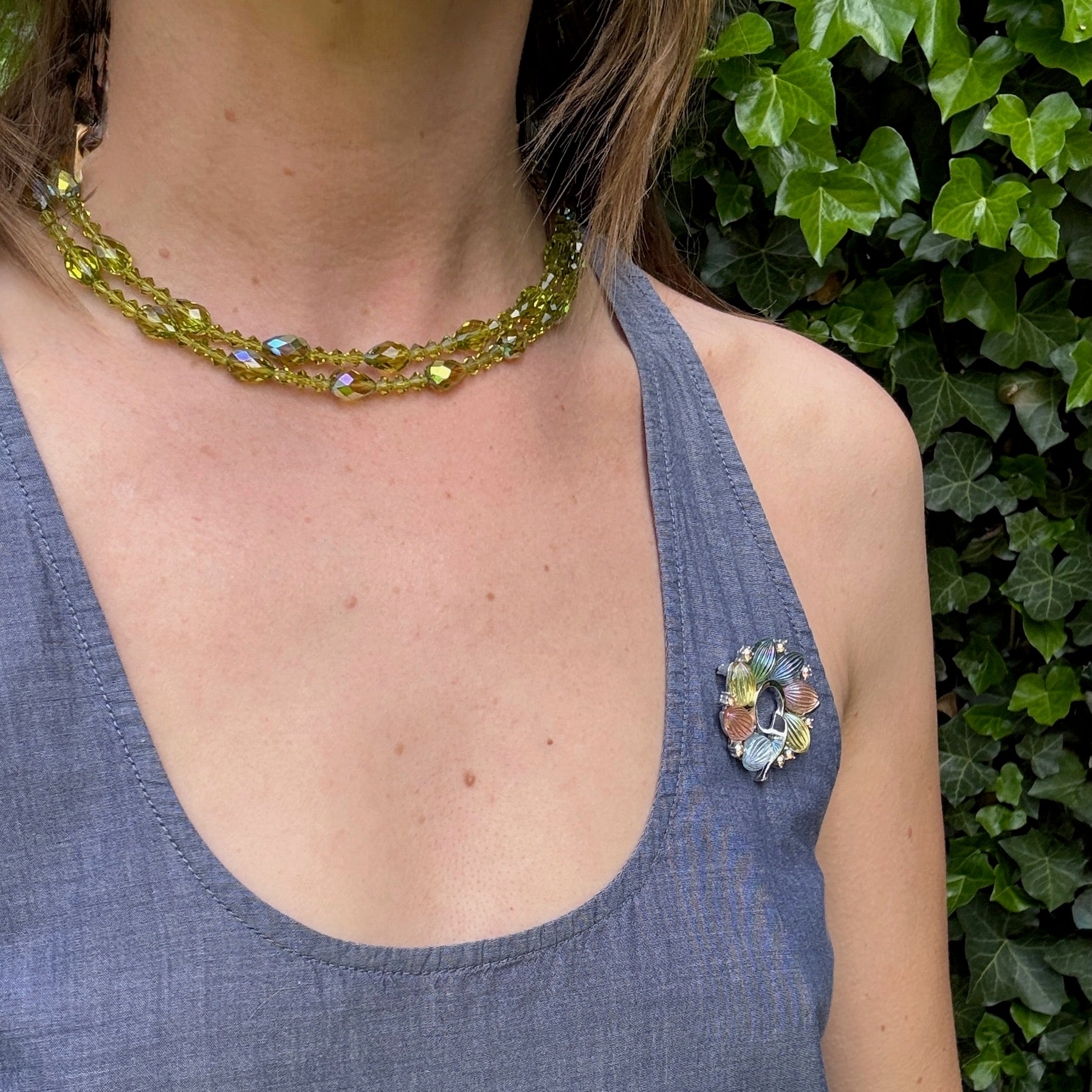 A double strand of faceted lime-green glass beads, fresh and pretty for Spring. Large tear drop-shaped beads alternate with small bicone spacer beads. An iridescent aurora borealis finish has been applied to the larger beads, giving them depth and a pretty rainbow finish. The two strands are connected by silver-toned spacer bars set with round, white rhinestones. This bright necklace is finished with a hook and a beaded extender chain. Circa 1950.