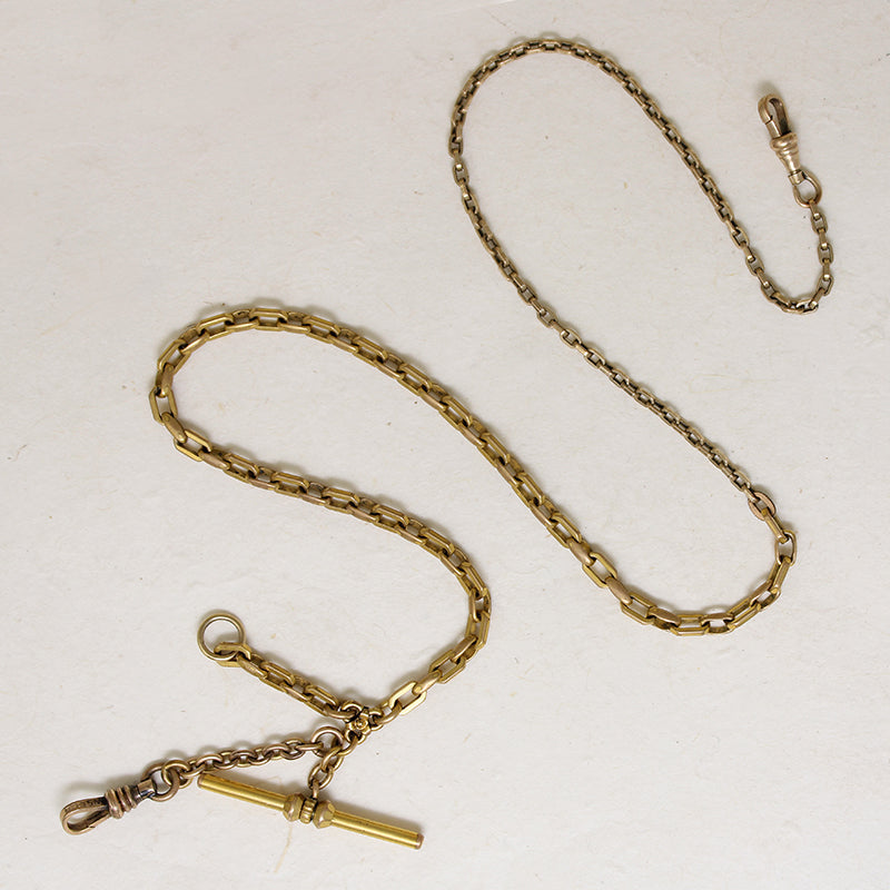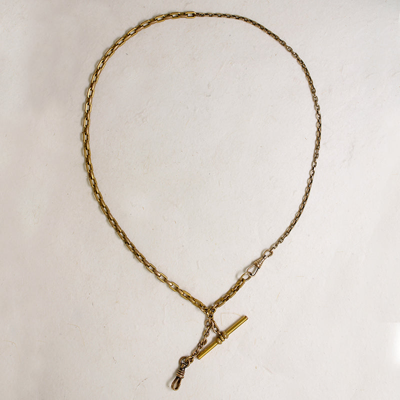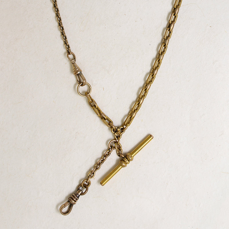 Two gauges of matching antique cable chain are married in this handsome artisan necklace. The squoval-linked, gold filled chains clasp jauntily in the front with a gold filled watch hook. A watch hook and t-bar dangle hangs from a trefoil connecting link, perfect for displaying all of your best bits & bobs. Ingredients date circa 1890 to 1910.