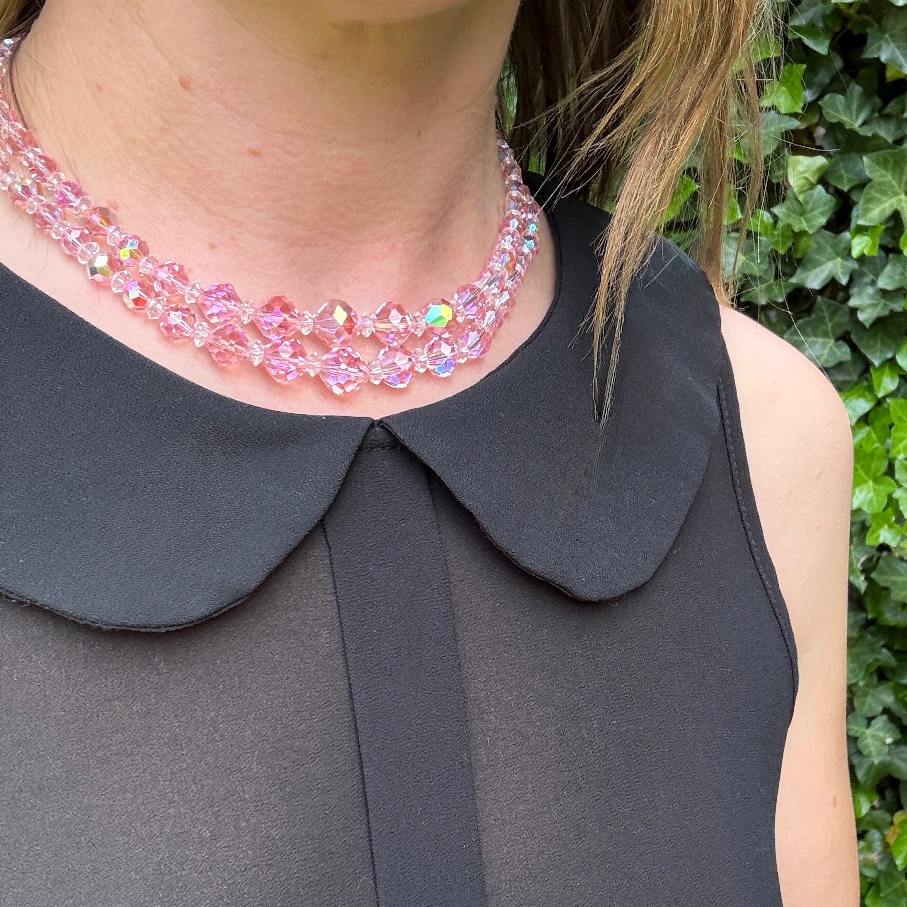 Pretty in pink. This lovely double strand necklace of graduated pink glass beads is imbued with feminine allure. The beads are crisply faceted, alternated with small white spacer beads. An iridescent aurora borealis finish has been applied, the powder pink color is given depth by the rainbow finish. The two strands are connected by silver-toned, baguette rhinestone-set spacer bars, and finished with a hook and a beaded extender chain. This necklace is just as sweet as can be. Circa 1950.