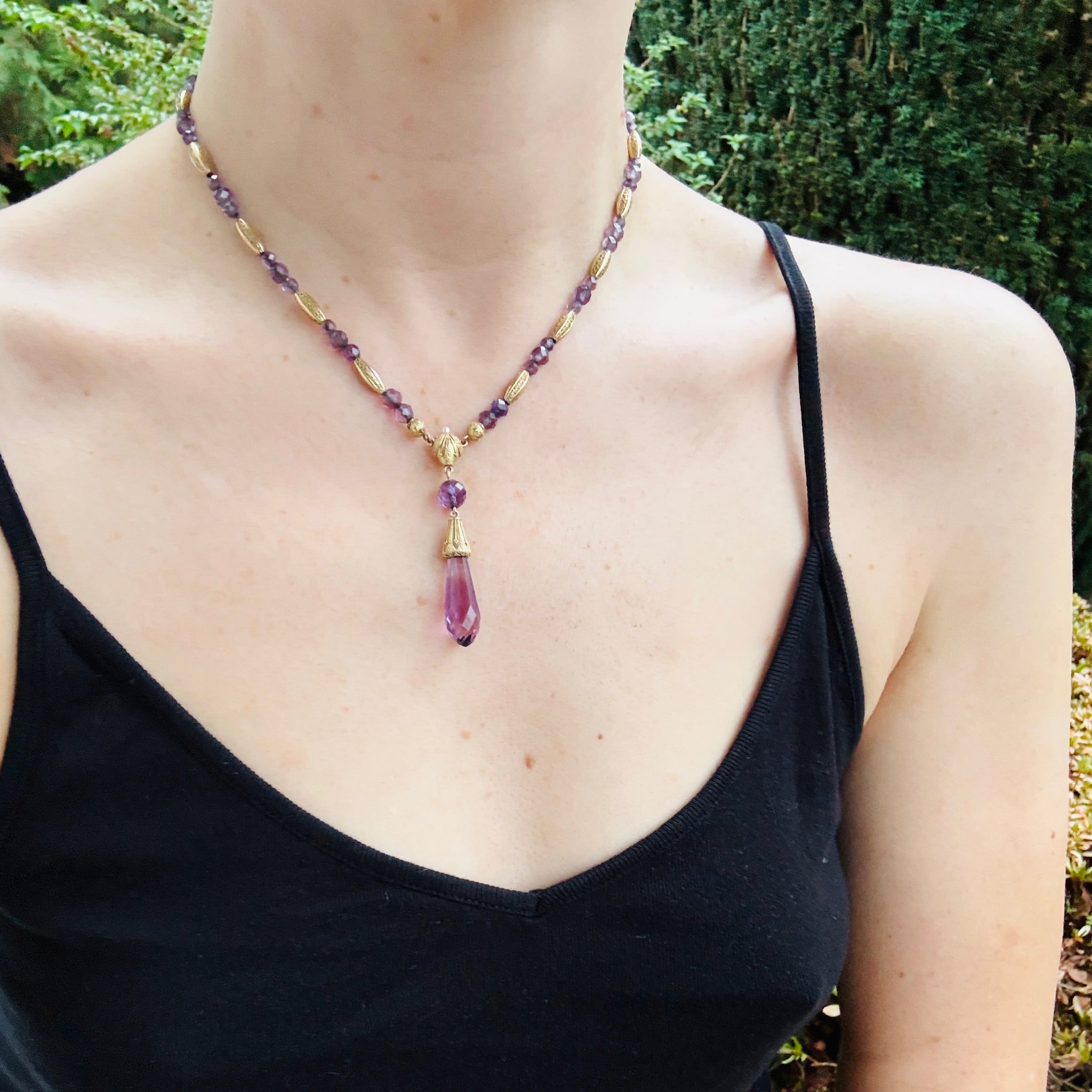 Details...The necklace has a wearable length of 16.5". The pendant drop is 2.25" long. The largest amethyst beads on the chain are 5.1mm the longer gold beads are 11.4mm x 4.5mm, & the amethyst pendant is 9.1mm at its widest. In Excellent Antique Condition. You should always expect some wear on vintage and antique jewels; we consider it part of the charm.