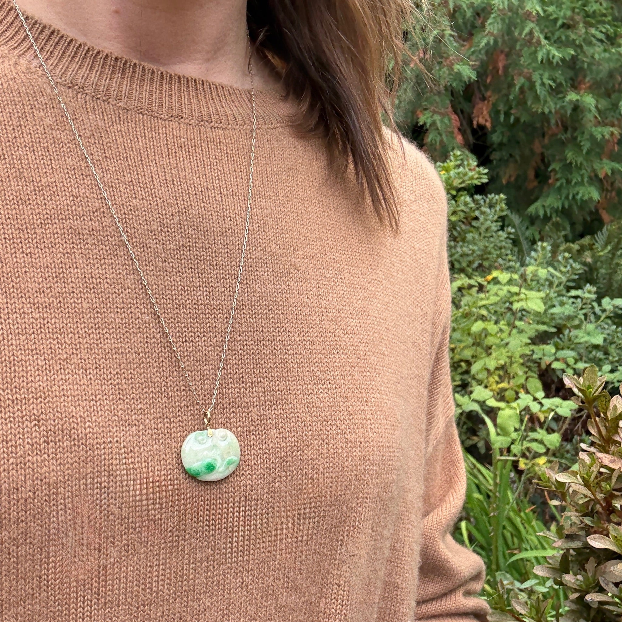 This antique bat pendant feels like a lucky charm. The wee bat is carved from an oval of green and white jade; he has a stylized form with adorably curled wings. It appears he is perched in a fruit tree. The carving is topped with a 14k gold bale and jump ring. In Chinese culture bats are associated with good luck and fortune, you can tell this auspicious little creature has been worn smooth by many optimistic hands over generations. Circa 1900.