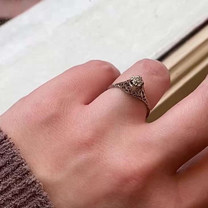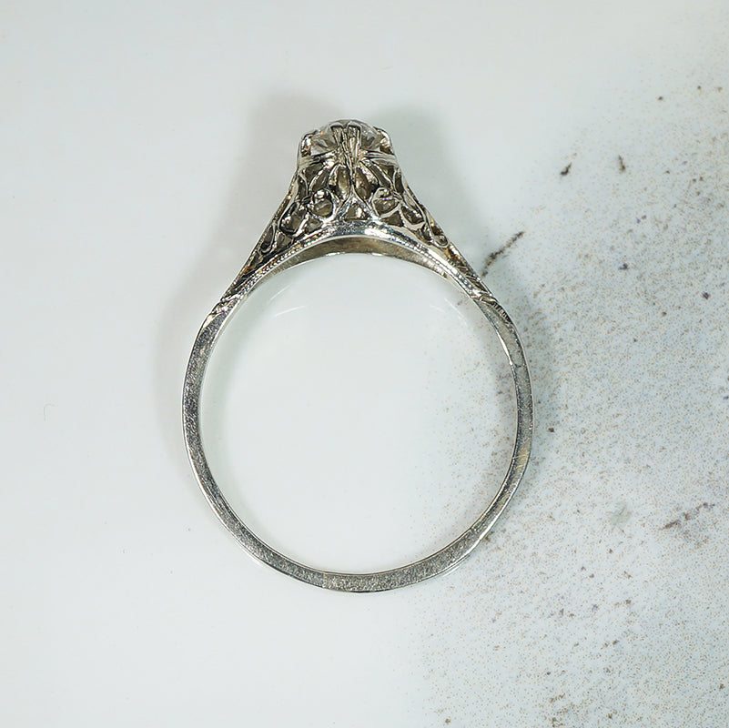 This lovely ring has pretty forget me not flowers and swirly designs in the 18k white gold filigree. Set with a lively .40ct old mine cut diamond, with a personal engraving inside the band dating this ring to 1923.