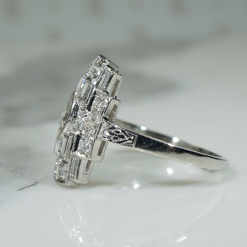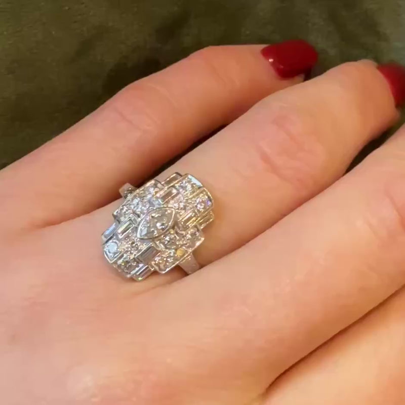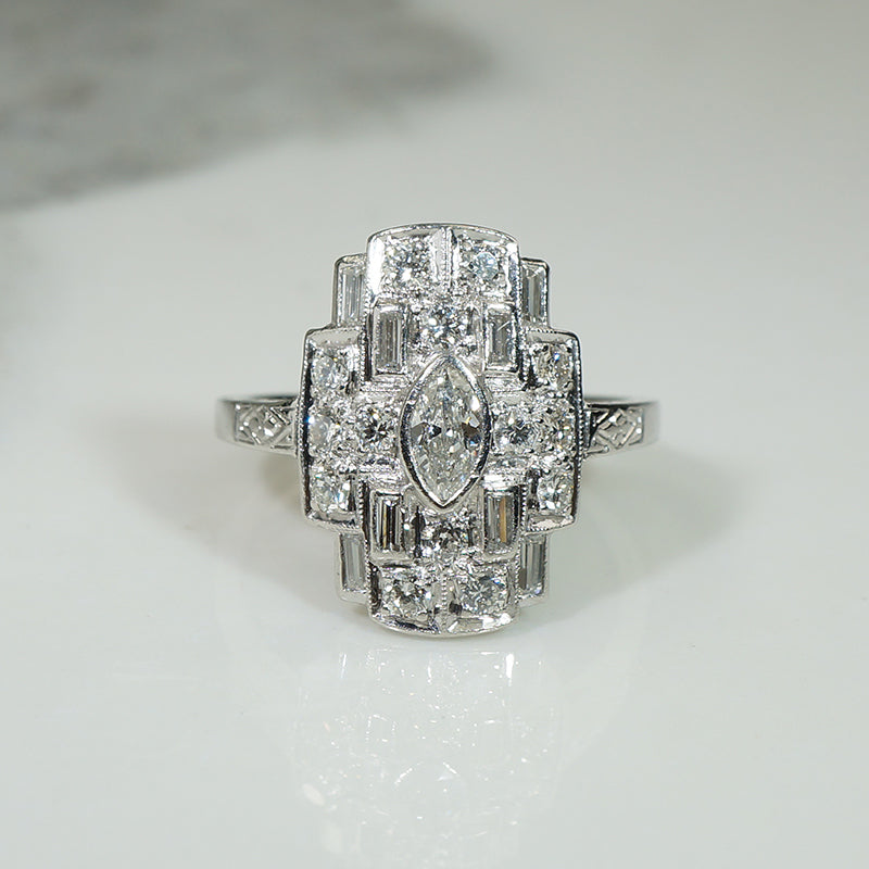 Platinum Beauty. The details of this lovely ring are fabulous, every diamond chosen to enhance the design. The center holds a bezel set early marquis cut diamond with an open culet. Each corner has a pair of baguette diamonds stepped up from the marquis, the remainder of the surface is covered in old euro diamonds in stepped rows. This ring is an amazing example of early Art Deco. The diamonds have a total weight of 1.25 carats. Circa 1920.