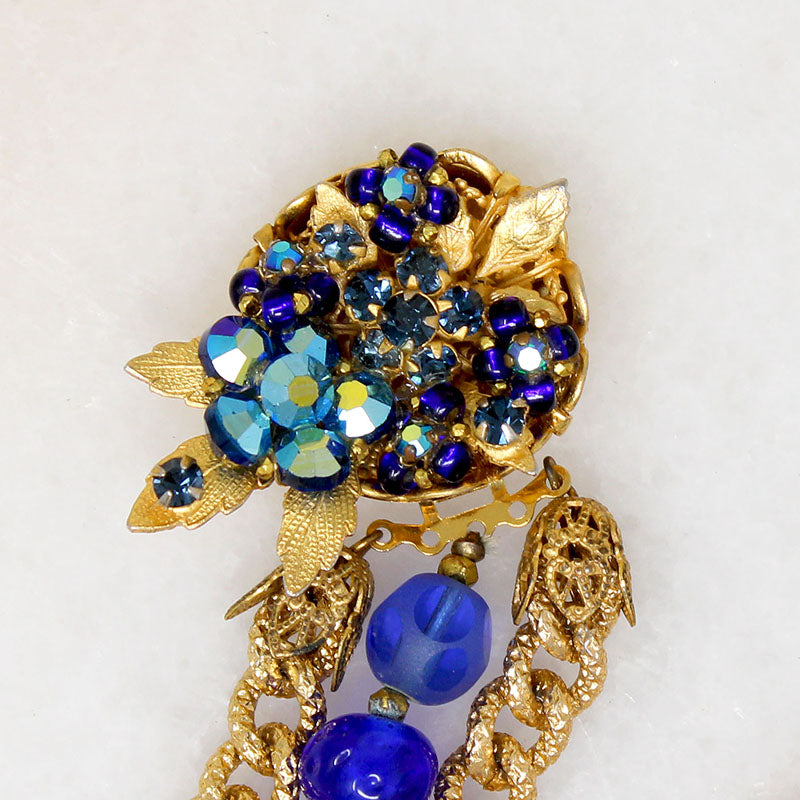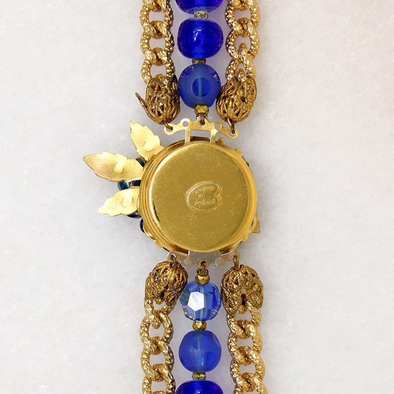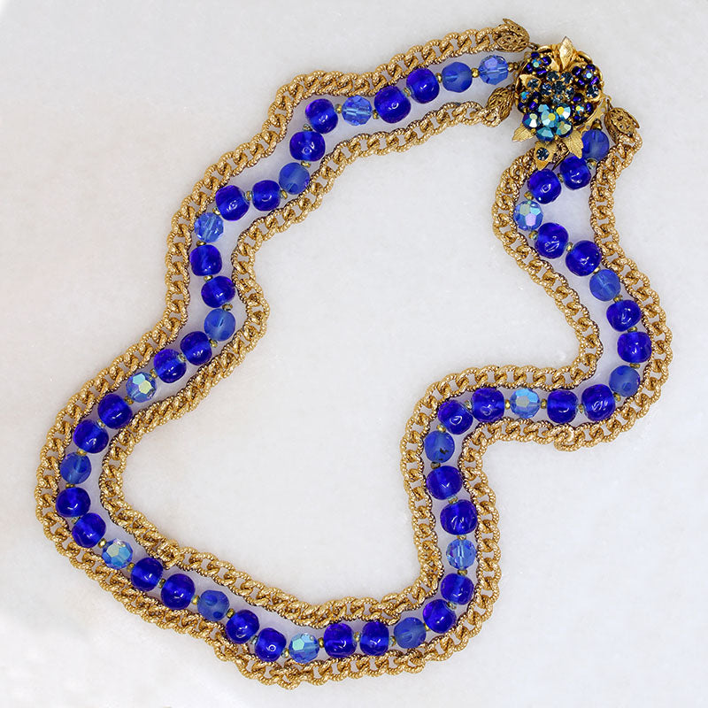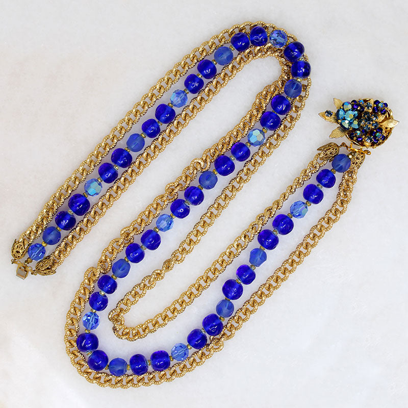 Elaborately engraved golden chains flank a strand of cobalt blue beads in this dramatic Original by Robert necklace. The beads have a variety of facets and finishes, but all are a brilliant shade of blue. The decorative clasp is a bowl of bright blue crystal blossoms, accented by gold-tone leaves. Signed "Original by Robert" on the clasp's back. A striking statement piece with a thousand fascinating little details.. Circa 1960.
