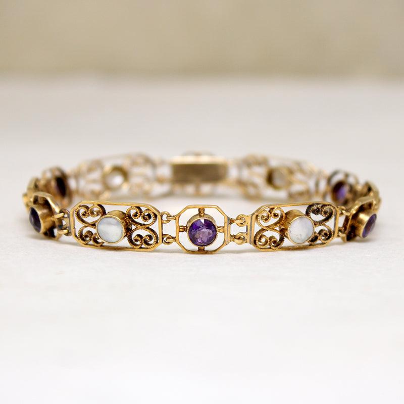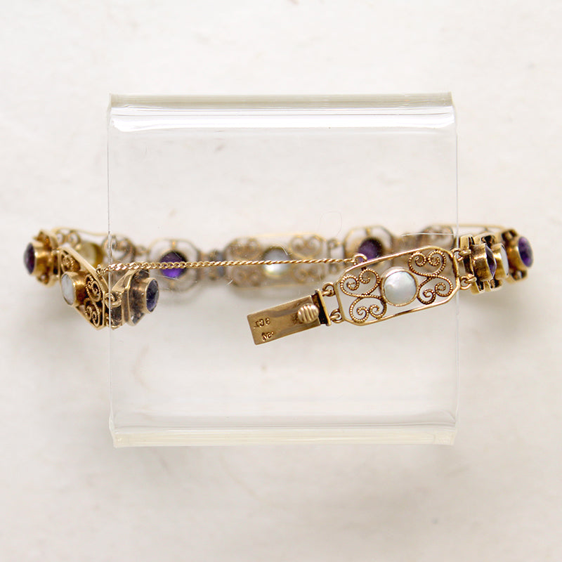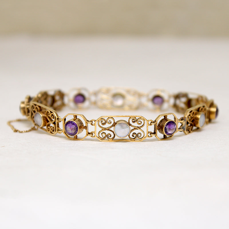 An enchanting Art Nouveau bracelet from Murrle Bennett. Exquisite 9ct gold filigreed links are set with bright purple amethyst and dreamy mother of pearl discs. The piece fastens with a slide clasp, and a safety chain has been added for security. The clasp's tongue is stamped "9ct" and bears Murrle Bennet's maker's mark. Circa 1900.
