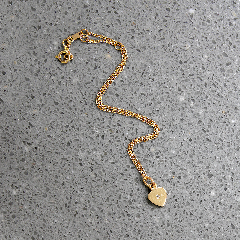 A delicate 14k gold cable link bracelet with a dainty diamond-set heart charm, just as sweet as can be. The heart charm is flat; the diamond is inset on the front, and the back is polished. It hangs from the chain on a decorative jump ring of twisted gold wire. The fine gauge chain is adjustable in length and fastens with a spring ring clasp. All the materials in this modern bracelet are recycled.