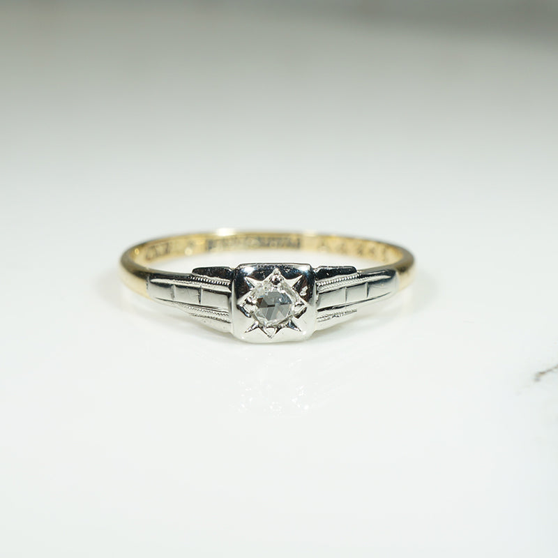 A delightful Deco era ring in 18k yellow gold with the top in platinum. This 1930's ring is set with a 19thc rose cut diamond with the most fantastic triangular facets, what a delightful sparkly dome of a diamond! The designs on the shoulders remind me of great Art Deco architecture. What a wonderful and unique engagement ring.