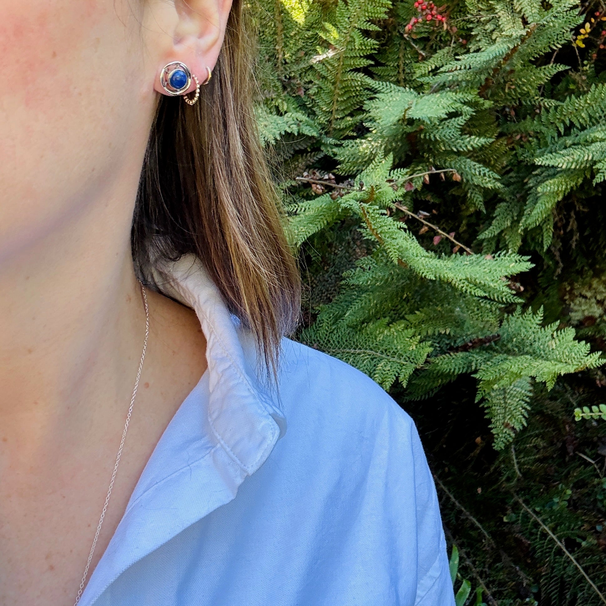 Cabochons of deep blue lapis lazuli sit at the center of these artisan stud earrings. Each small round gemstone is bezel-set at within a halo of softly scalloped recycled sterling silver. These studs are comfortable to wear and very pretty.