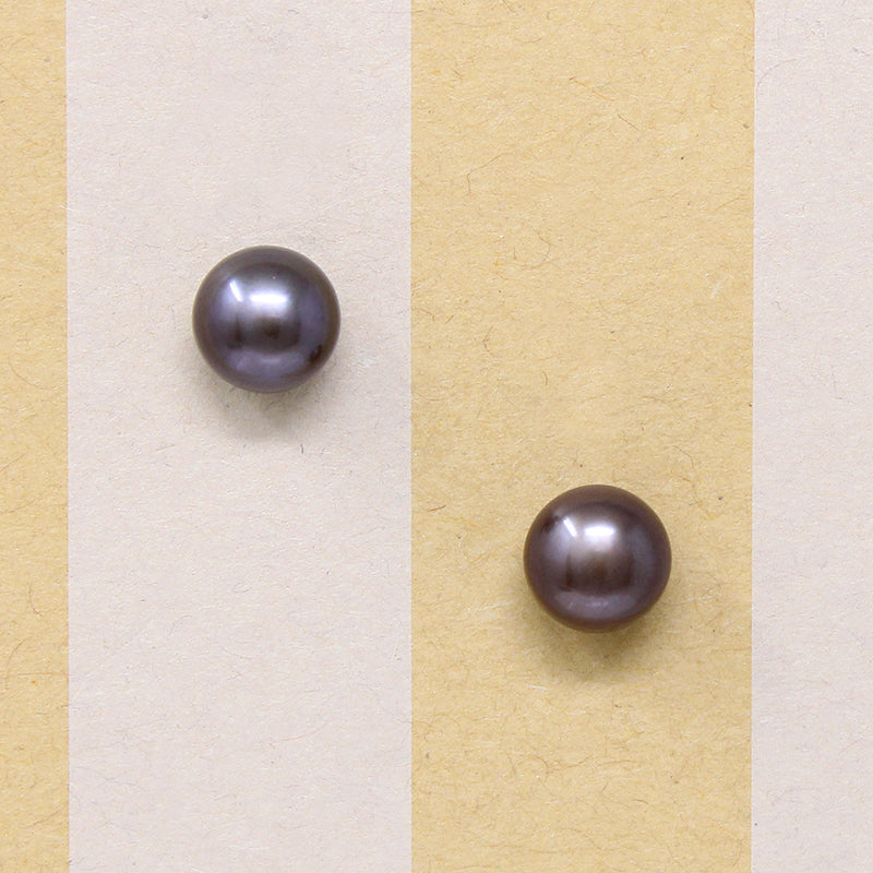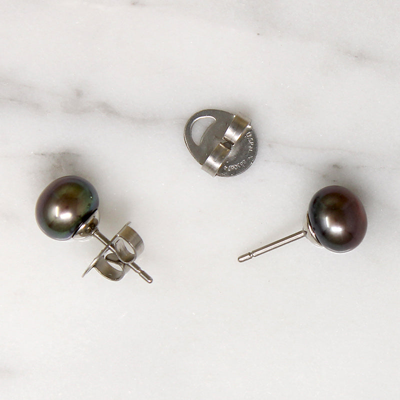 Dark gray freshwater pearls are set in stainless steel stud earrings. The subtly iridescent vintage pearls are a soft button-shape. They sit in steel pearl cups, on classic posts with an unusual style of tension backs. Pearl studs are always in style, the intense color of these pearls give these earrings drama. Circa 1980.