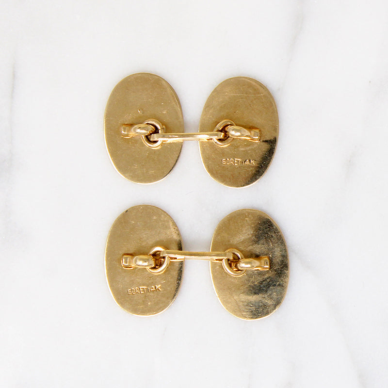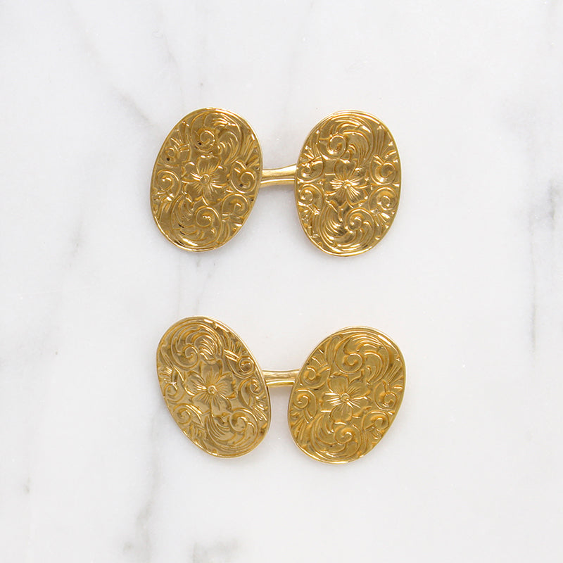 Luxurious Edwardian cuff links of exquisitely engraved 14k gold. The double-panel links have oval faces and feet, both incised with a glittering floral design. The engraving is in wonderful crisp condition. This style of link sits very flat on the cuff, they are lightweight and easy to wear. Marked "14k" on the back. Circa 1900.