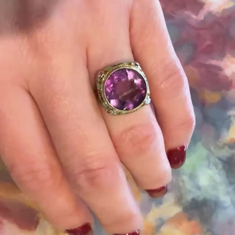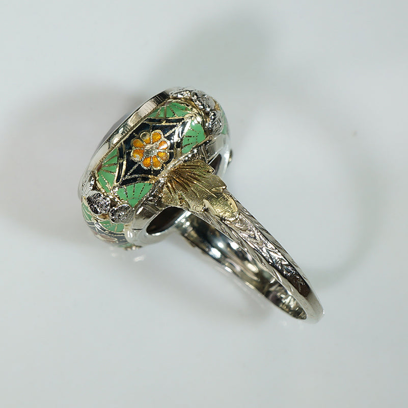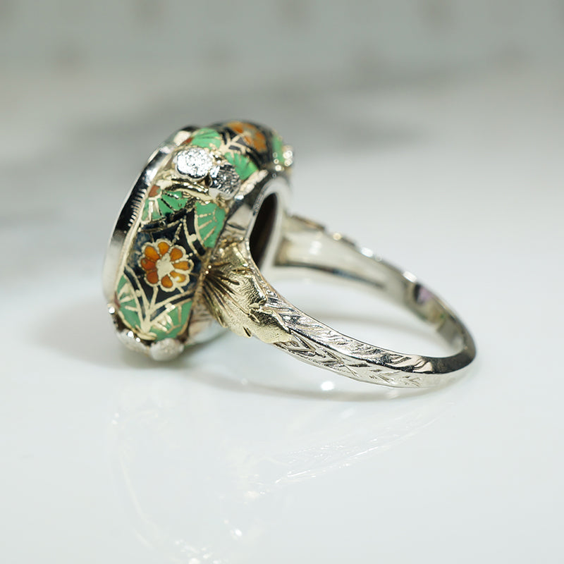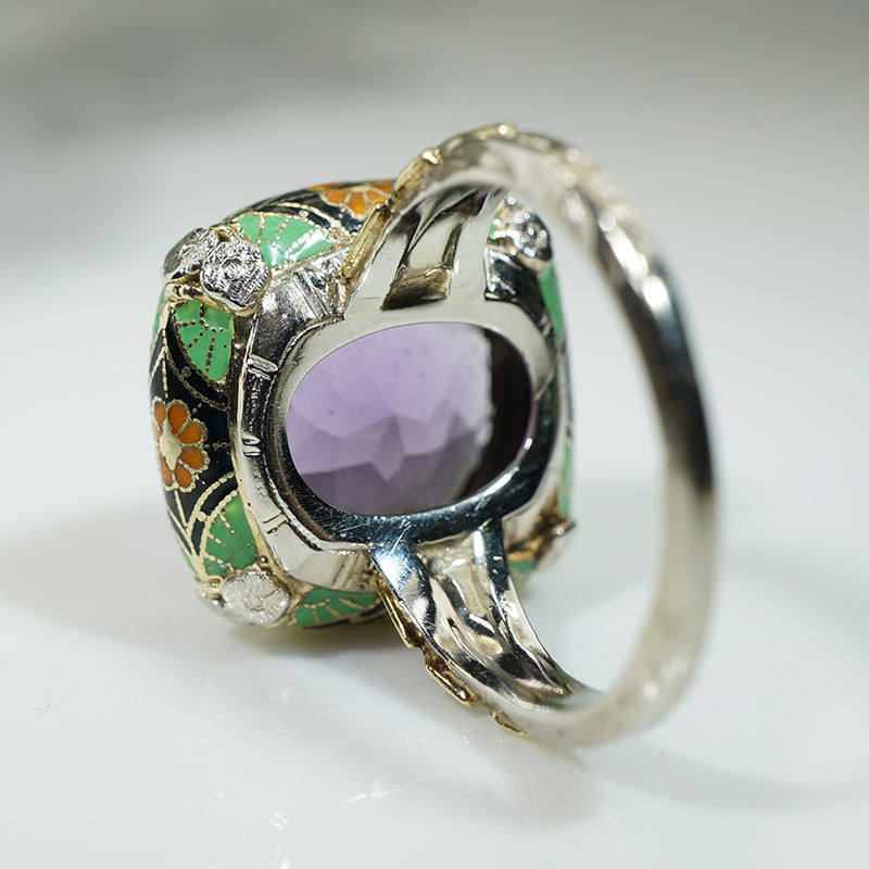 This 1920s amethyst and enameled 14k two-tone gold ring is a rare find. Every side of the ring's puffy, yellow gold top is enameled with orange flowers and green fans on a black field. A large, round, purple amethyst is set in a white gold bezel. Rich yellow gold shoulders are cut in engraved leaf shapes, overlaying an engraved white gold band. Elaborately detailed and quite beautiful. Circa 1920.