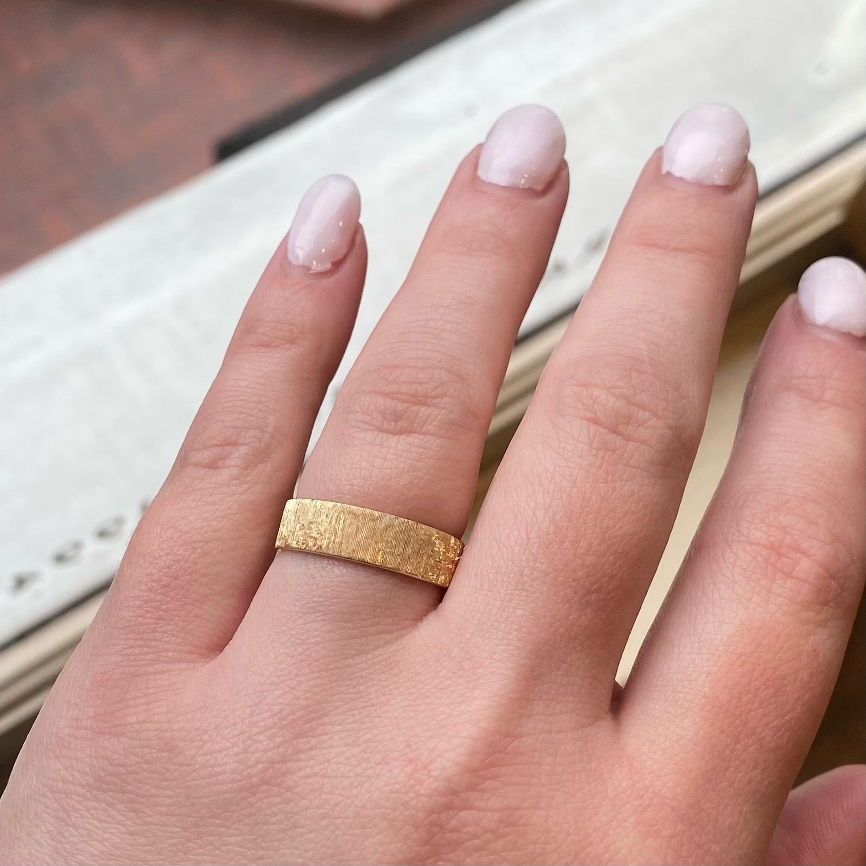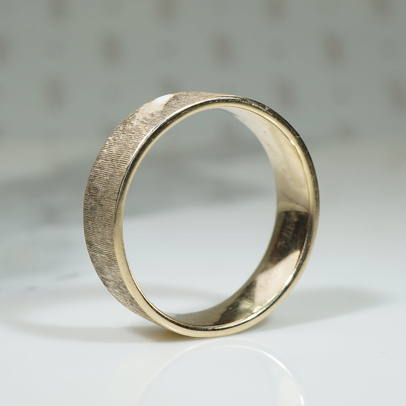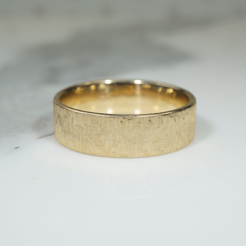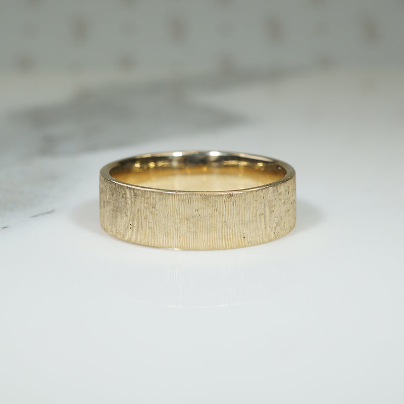 A gently curved interior creates a comfortable fit on your finger. A Florentine finish applied by hand to the flat surface adds a 170s splendor to the band. Hand Crafted and finished by us here. 14k recycled yellow gold.