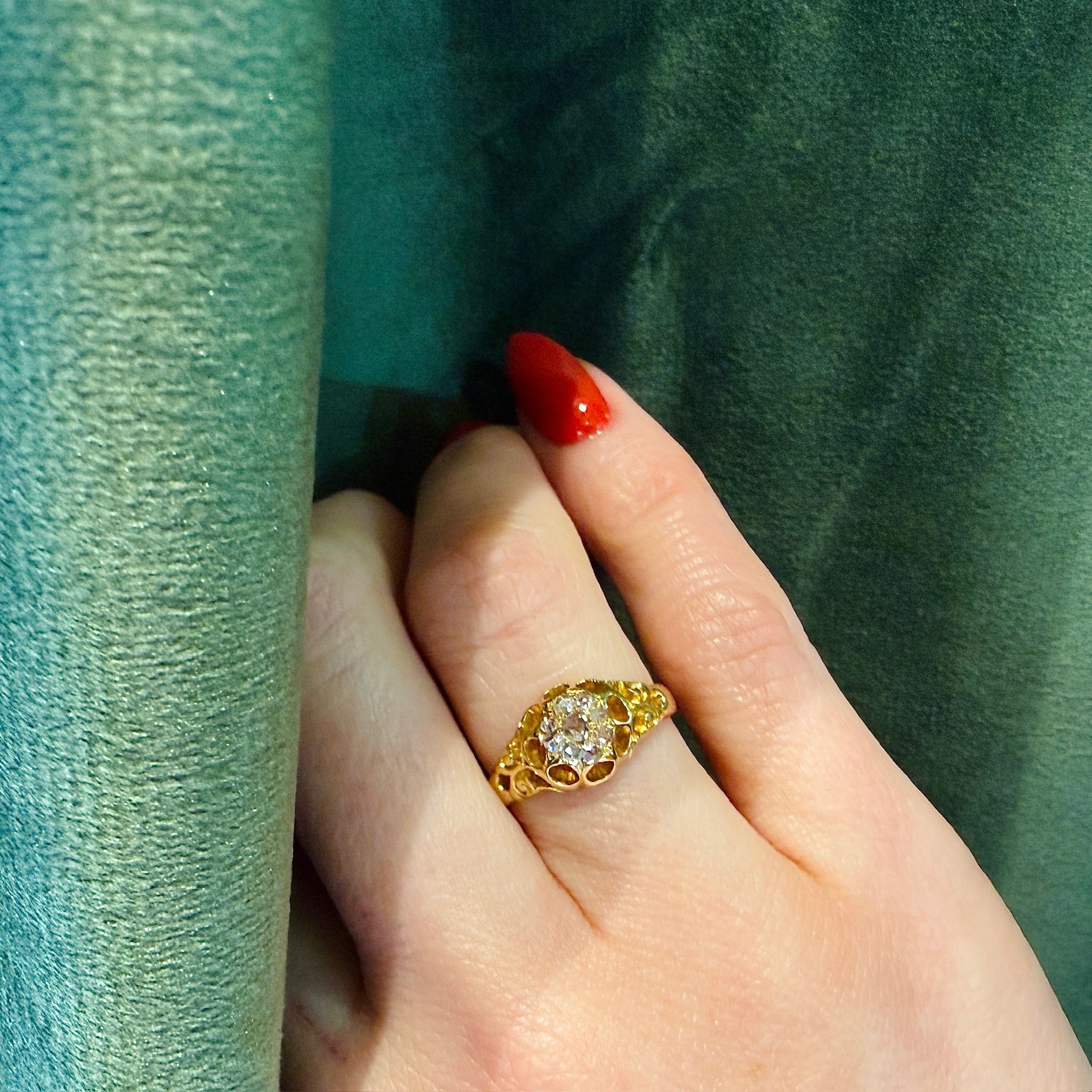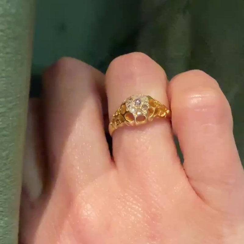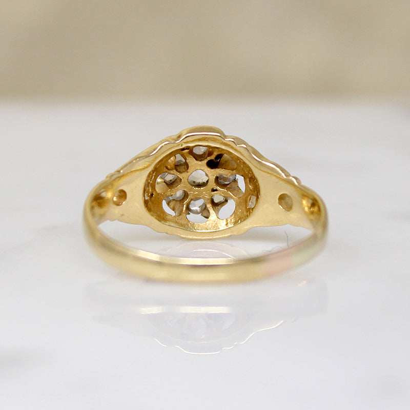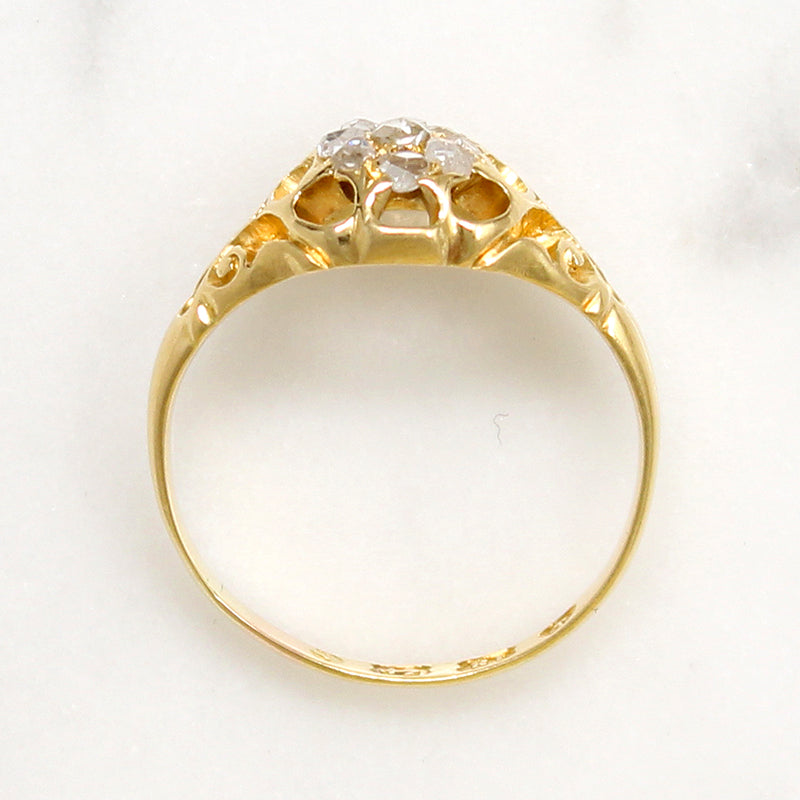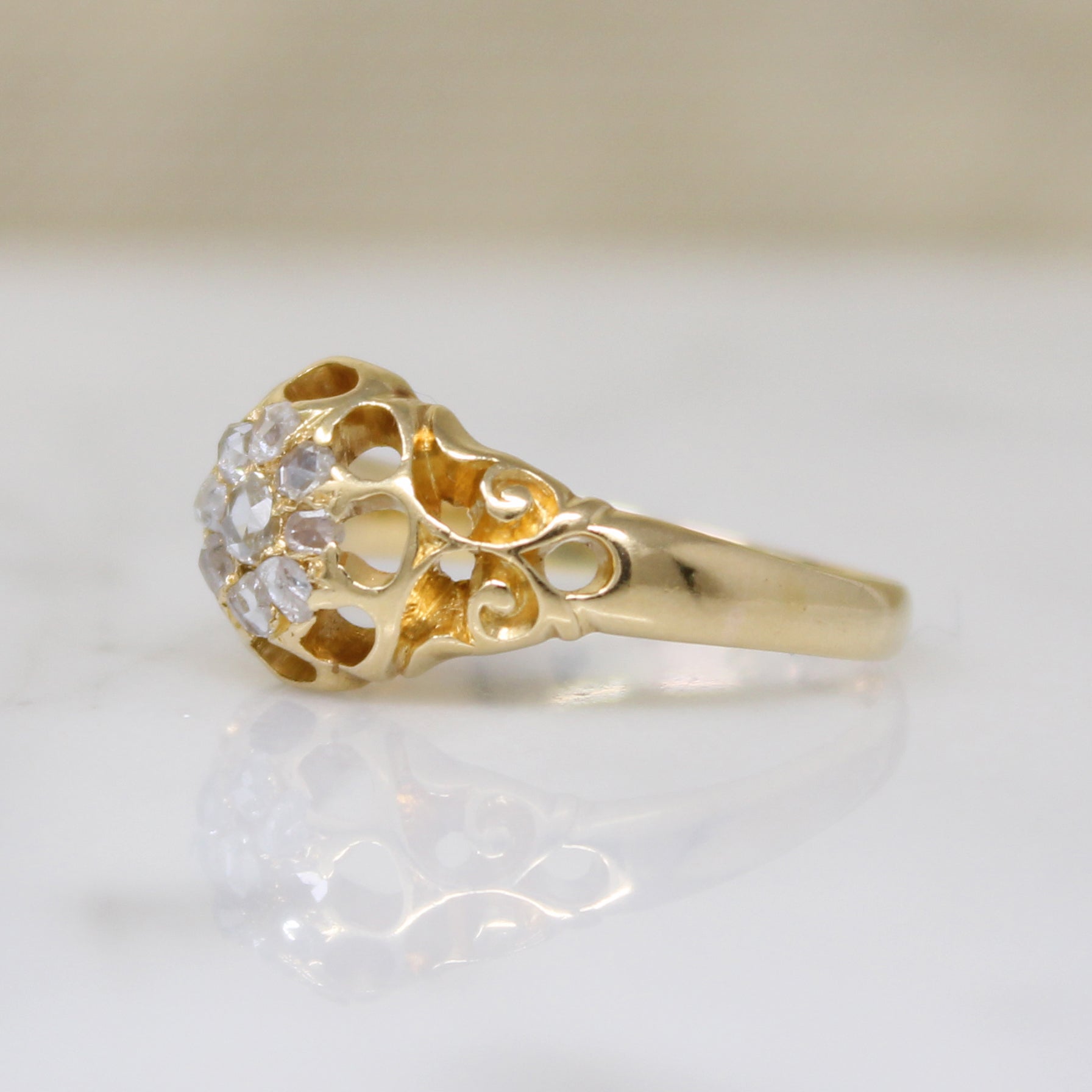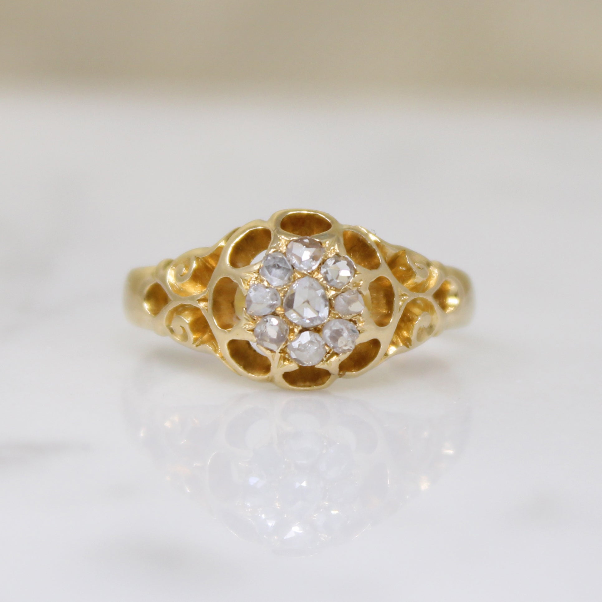 A fetching Victorian cluster of rose cut diamonds, set in a shapely 18ct gold belcher ring. Nine rose cut diamonds nestle together like a bright blossom blooming at the top of the ring. The many-pronged head forms scallops around the gems, like petals rendered in negative space. Wide shoulders are sculpted with openwork flourishes as they taper into a rounded band. The interior of the band bears hallmarks for England, Birmingham, 18ct, and the year 1867. Light and lacy with substantial finger coverage, this ring is perfect for any occasion.