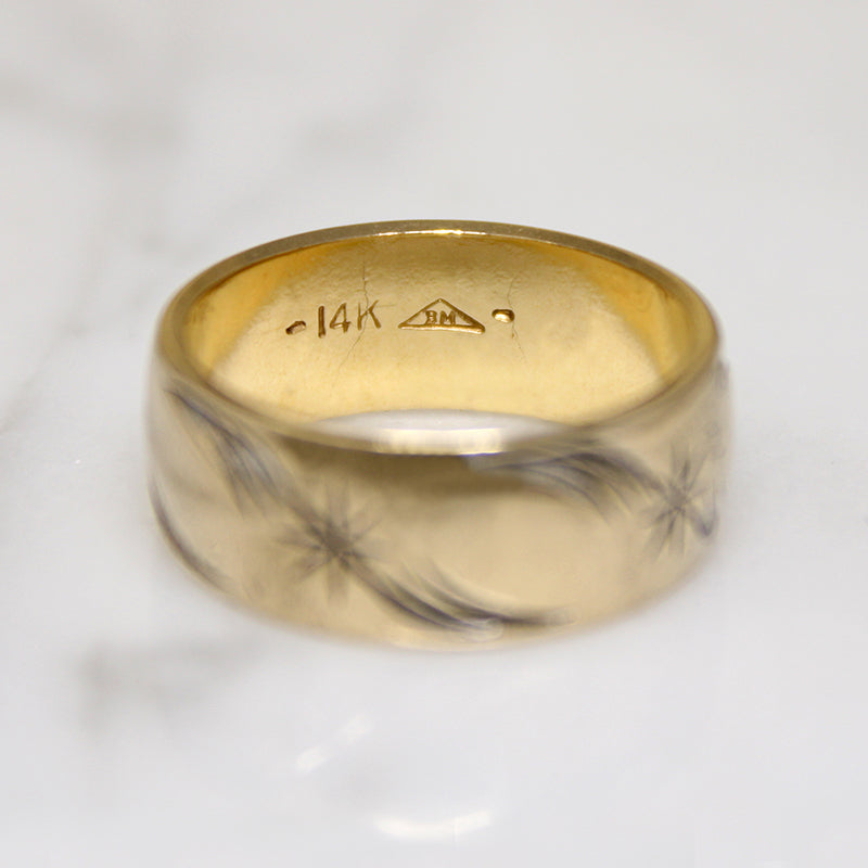 This playful 14k gold band is engraved with lively stars and flourishes. The band is quite wide, with a shallow half round exterior and a satisfying, substantial weight. This will make a very cool wedding band. Please remember a band this wide will fit more tightly than a standard size 10.25. Circa 1970.