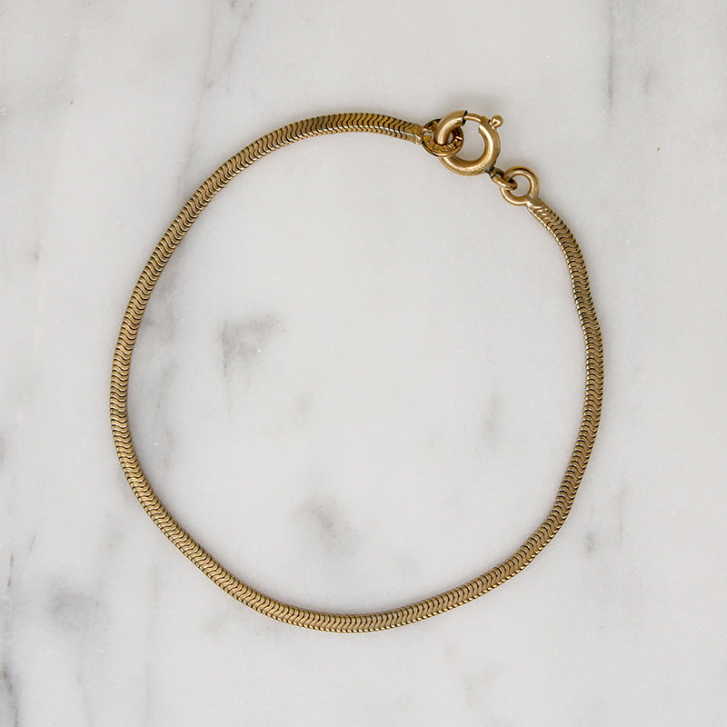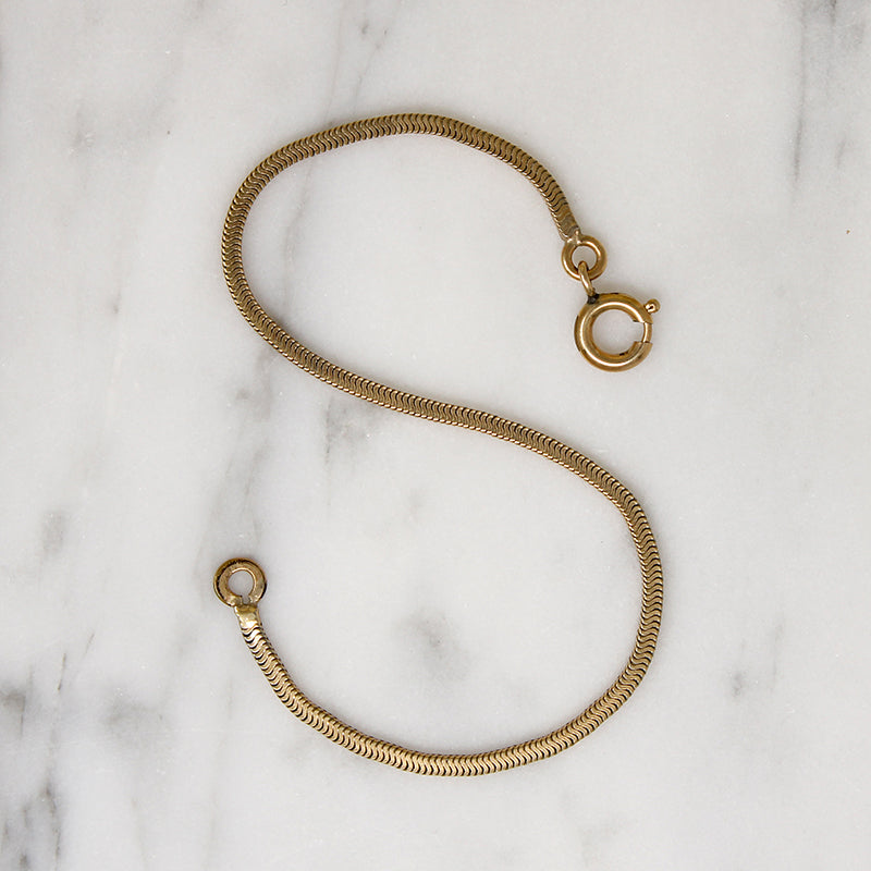 This gold filled snake chain bracelet is just the thing for adding a little glitter to your day. The woven links are sinuous and supple. A classic piece that fastens with a spring ring clasp. Circa 1950.
