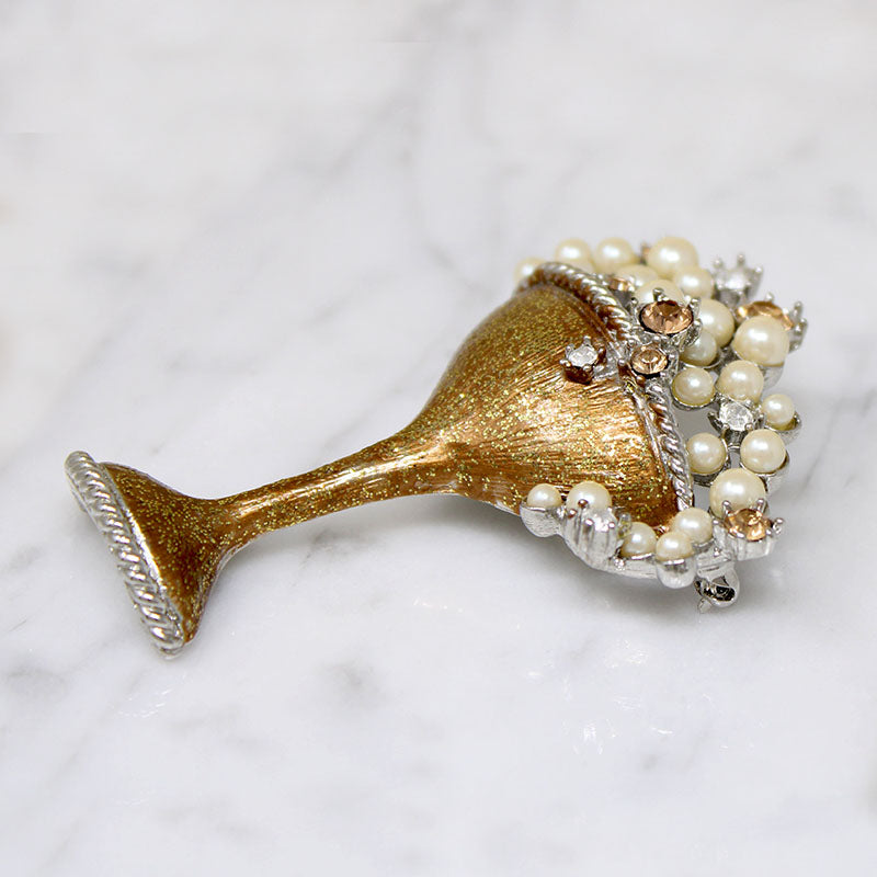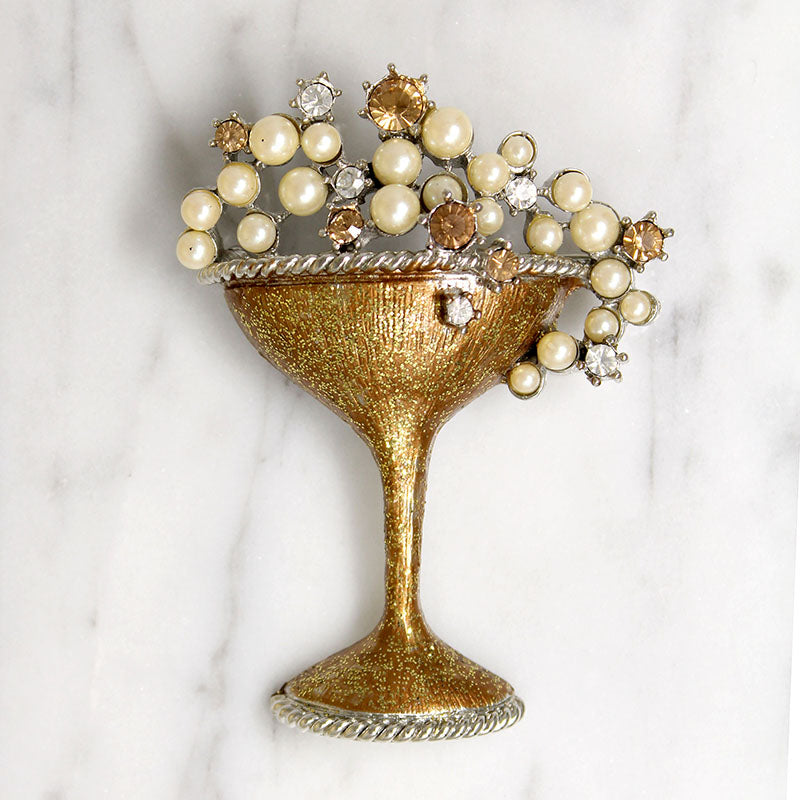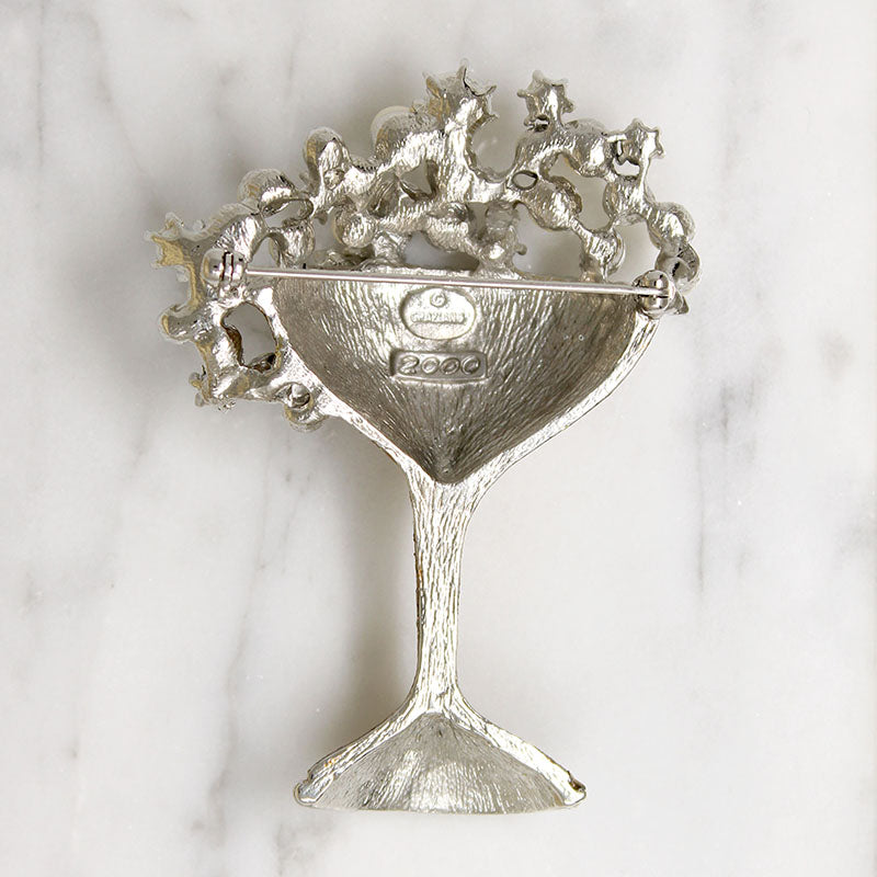 A jubilant champagne glass brooch celebrating the beginning of a new millennium. A gold-enameled champagne glass overflows with effervescent faux pearls bubbles spiked with gold Austrian crystals. This dramatic piece is perfect for celebrating any special occasion. It is signed on the back, "Graziano 2000."