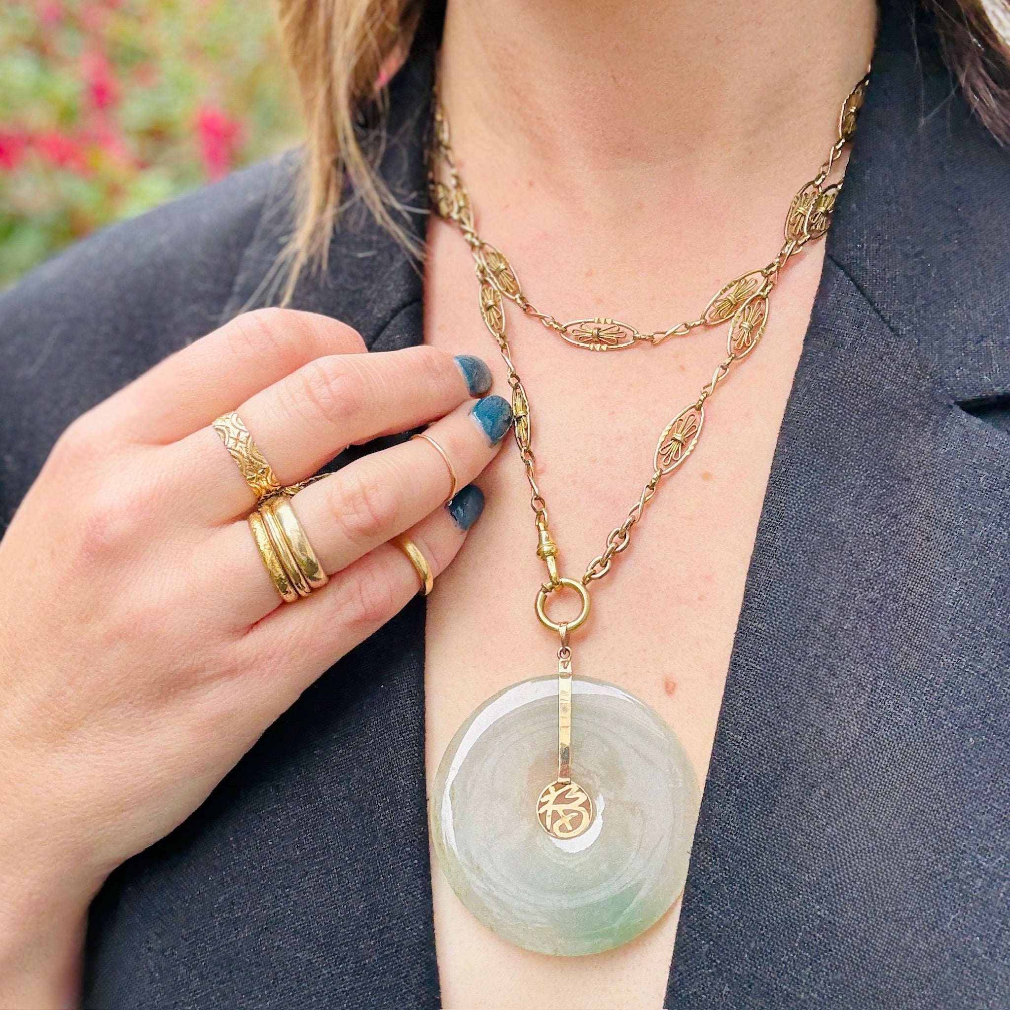 This classic donut pendant of subtle grey-green jade is fitted with 14k gold. A gold Chinese character sits in the donut's hole. A thin gold strip embraces the ring's radius, topped with a versatile bale. The simplicity of this piece highlights jade's natural beauty. Circa 1960.