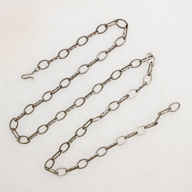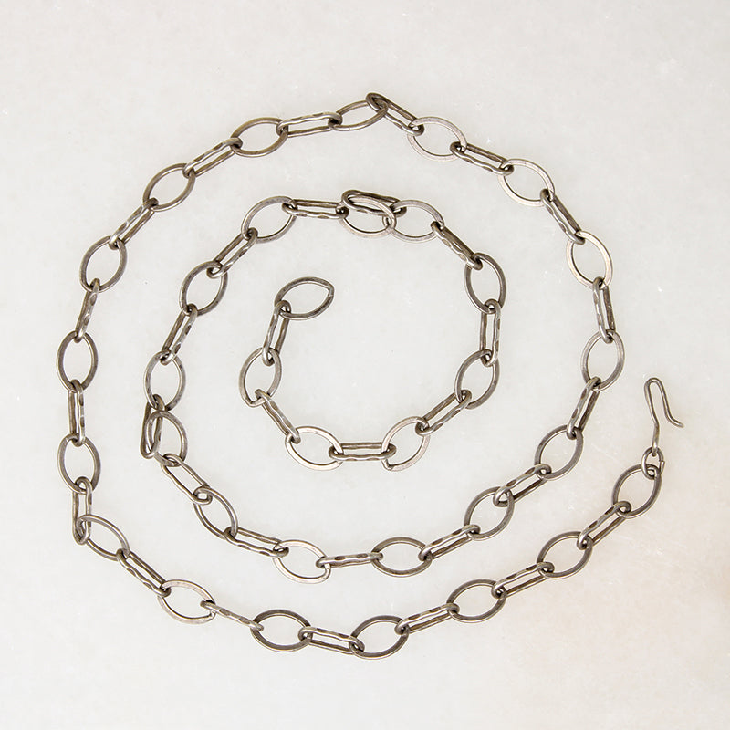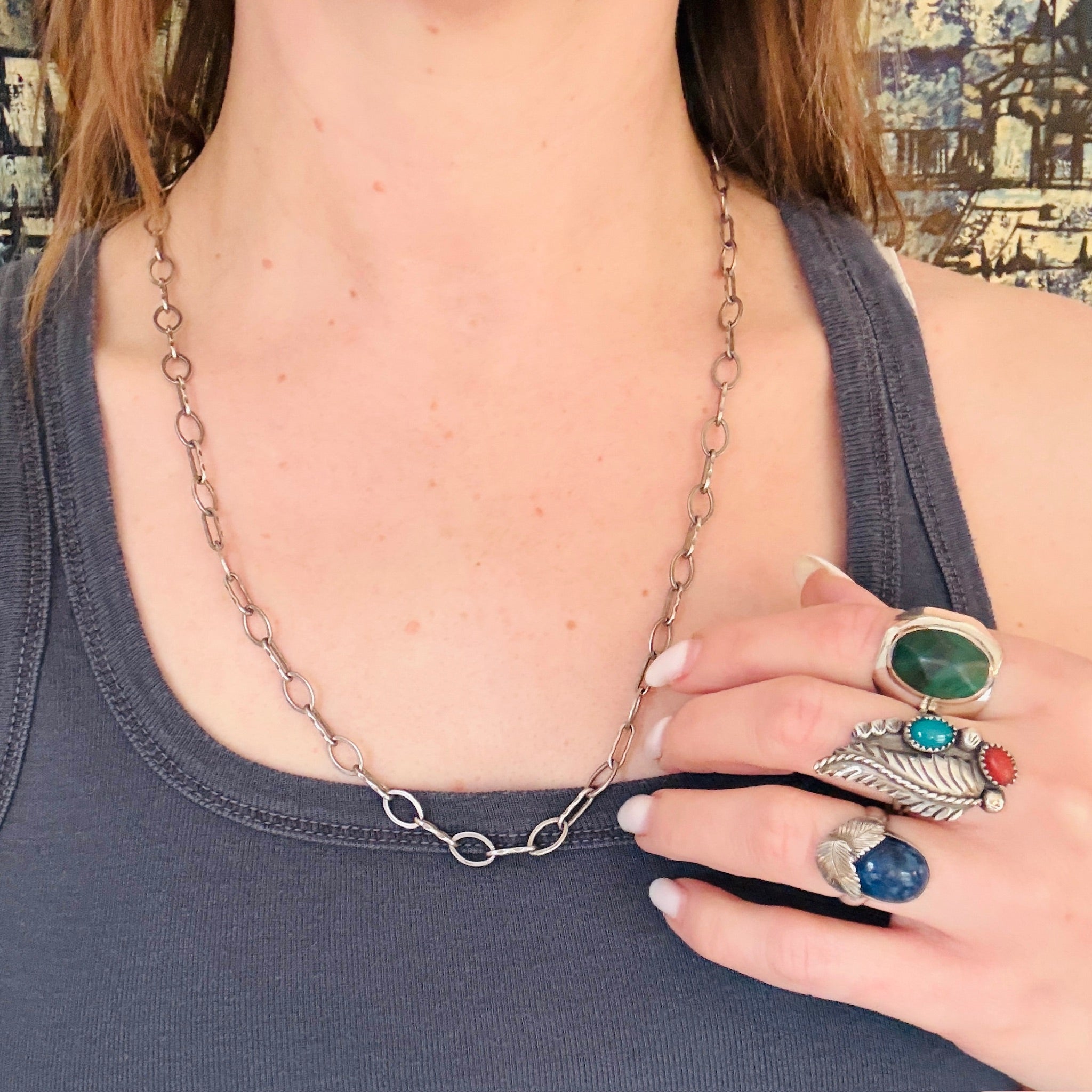 A hand made sterling silver chain with a fun, Modernist flavor. The links are alternating flat and twisted ovals, a look both delicate and industrial. The chain clasps with a hand wrought hook. Add some interesting texture to your Chain Game. Circa 1970.