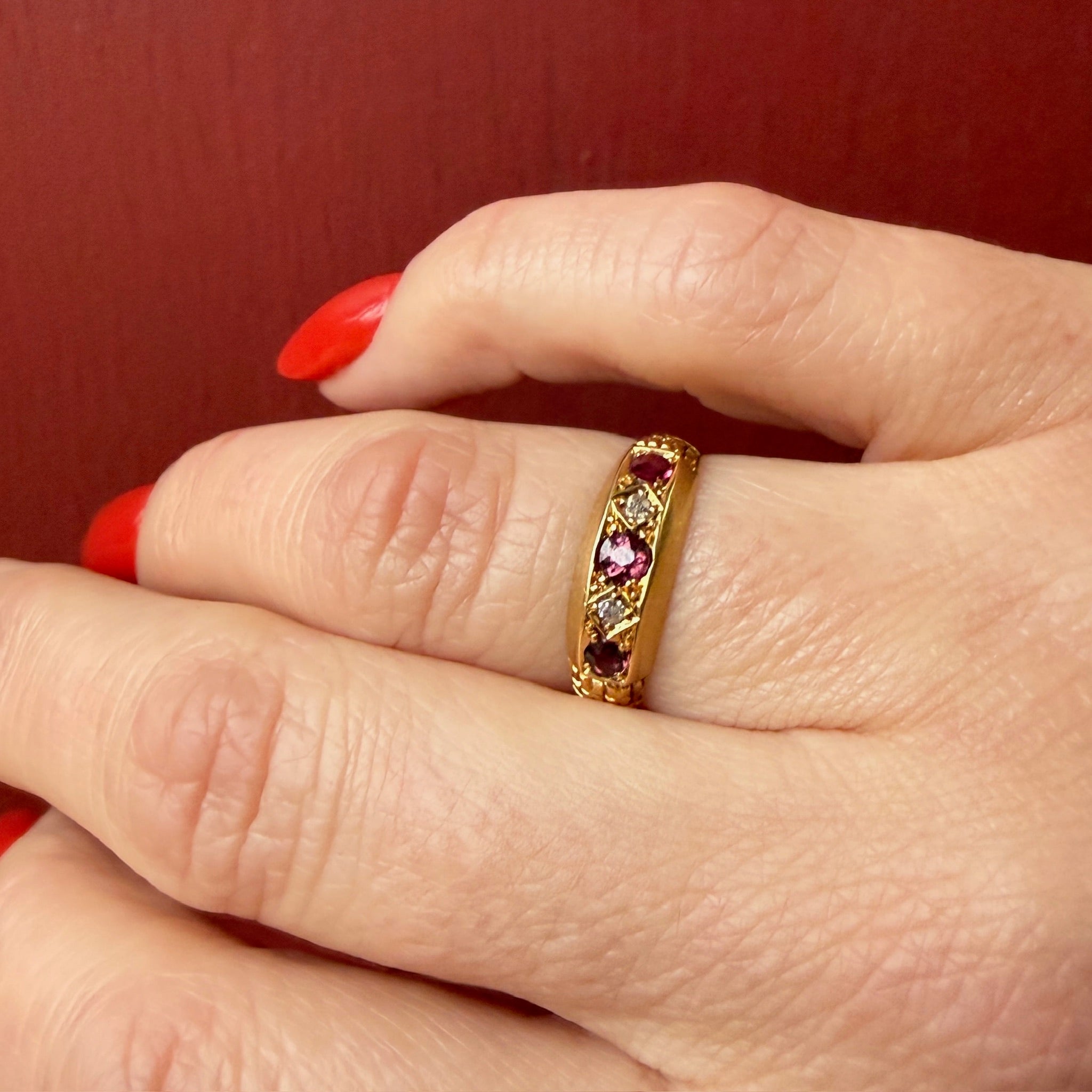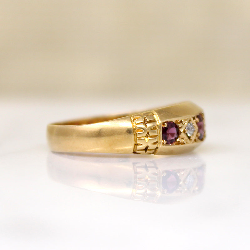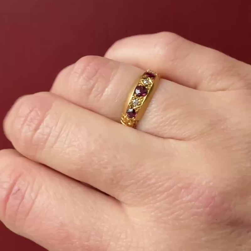 This handsome Edwardian band is set with rubies and diamonds in glossy 18ct gold. Three rubies alternate with two little diamonds, curved across the top of the ring. The rich red rubies are bead-set, while the diamonds are nestled in tiny incised squares. The band's geometric lines are emphasized by deeply sculpted shoulders. This band bears English hallmarks for Chester, 18ct, and the year 1913.