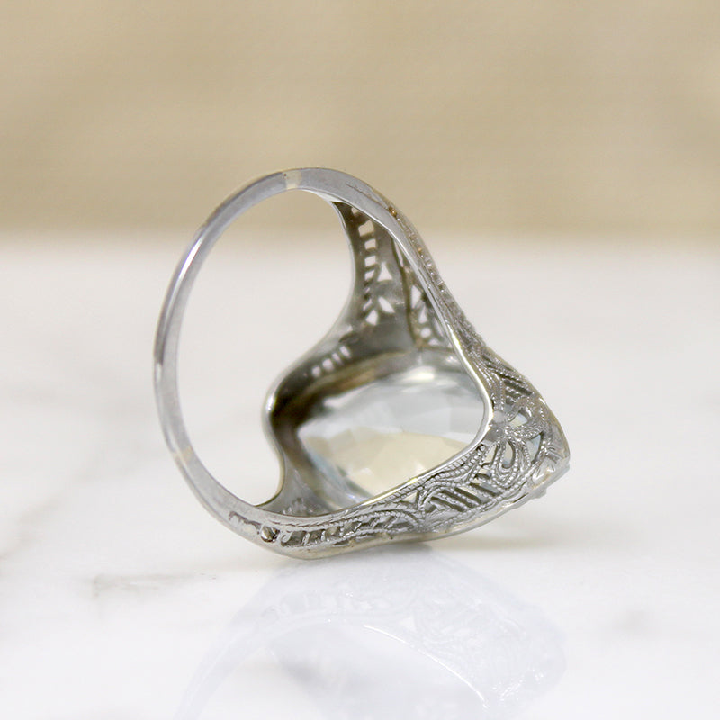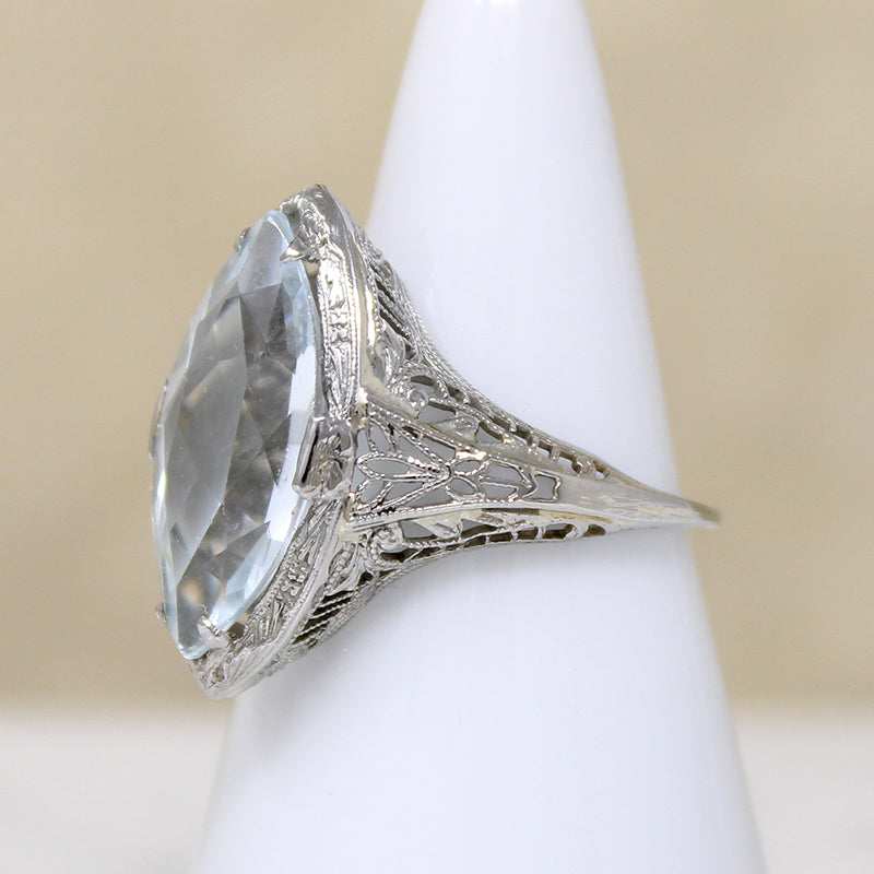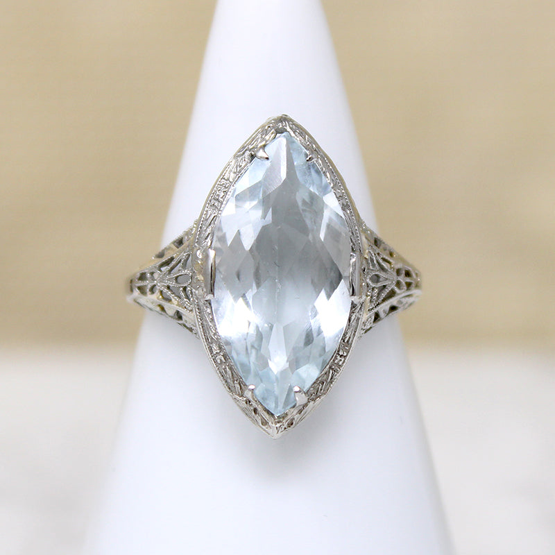 This dreamy navette ring is an Art Deco classic. An aquamarine of the most delicate ice blue color is displayed in a 14k white gold setting, covered in filigree and engraved details. The lacy shoulders and gallery are particularly exquisite, this ring is lovely from every angle. Circa 1920.