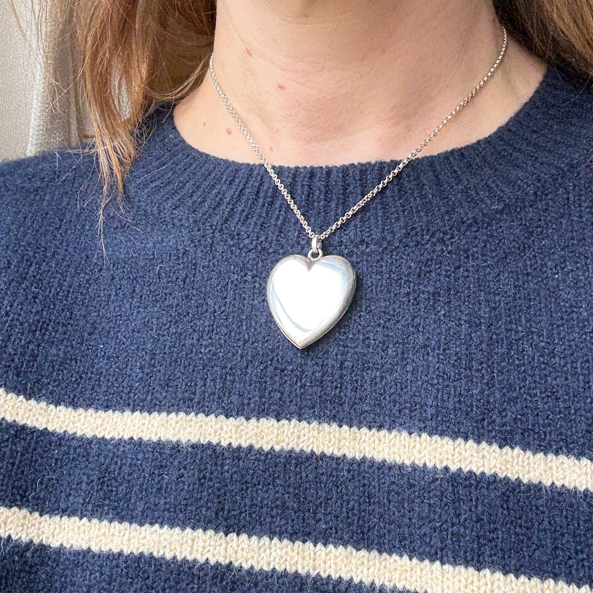 This ideal sterling silver heart locket dates to the Art Deco era. Perfectly plain on both front and back, the silver has that glossy patina only age can bestow. The locket has a nice tight closure, with two frames and no glass inside. An oval jump ring suspends the heart from a sterling rolo chain. This one will go fast. Circa 1930.