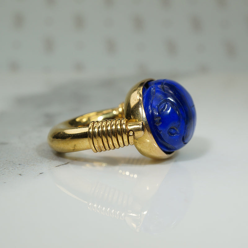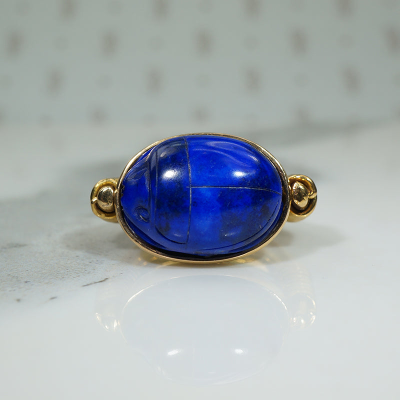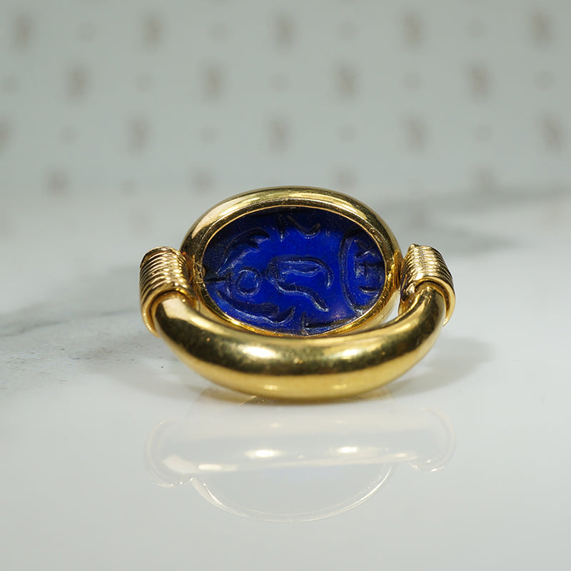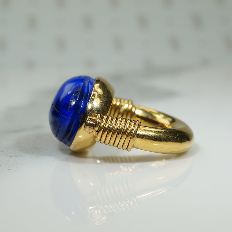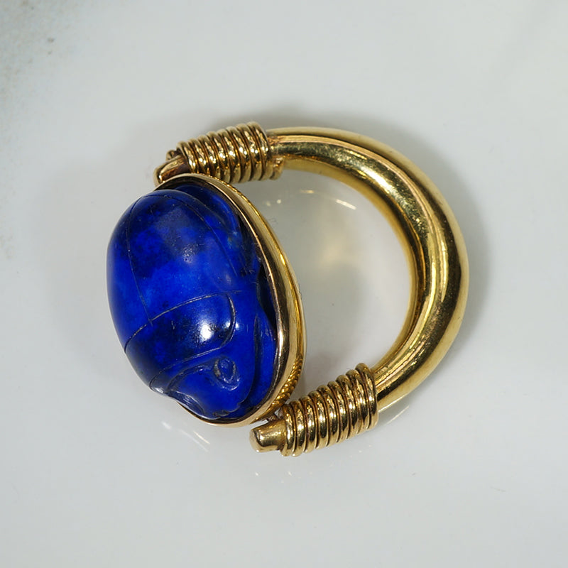 This gorgeous example of an Egyptian jewel features a hand carved Gem Quality Lapis Lazuli Scarab in a classical Egyptian swivel top ring. The back of the deep blue scarab has a group of hieroglyphs carved in it. The heavy 22k yellow gold bezel holds the scarab, pinned to a luxurious heavy 22k gold band accented by a twisted golden rope. The ring dates to the early 20thc.