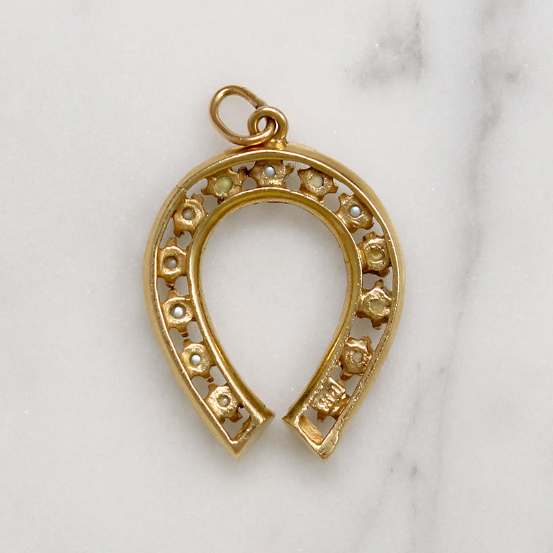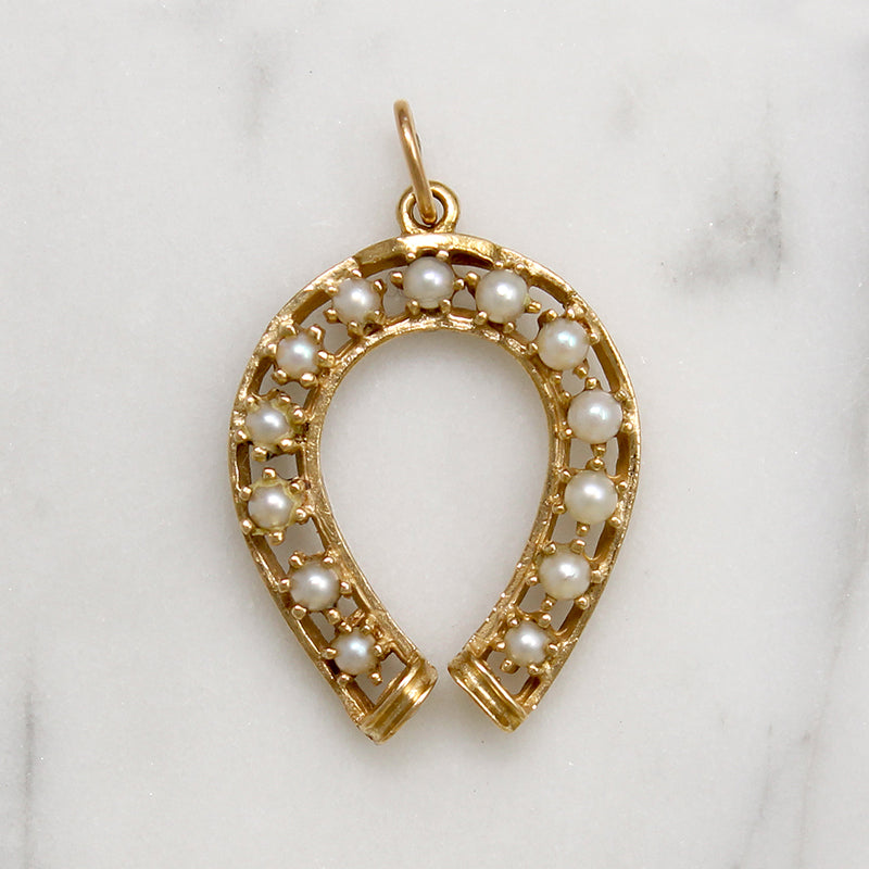 This Mid Century lucky charm is a pretty horseshoe. The pendant is an airy 14k gold arc, prong-set with thirteen creamy pearls. A jump ring has been added to its bale for ease of wear. Fun and fortuitous. Circa 1950.