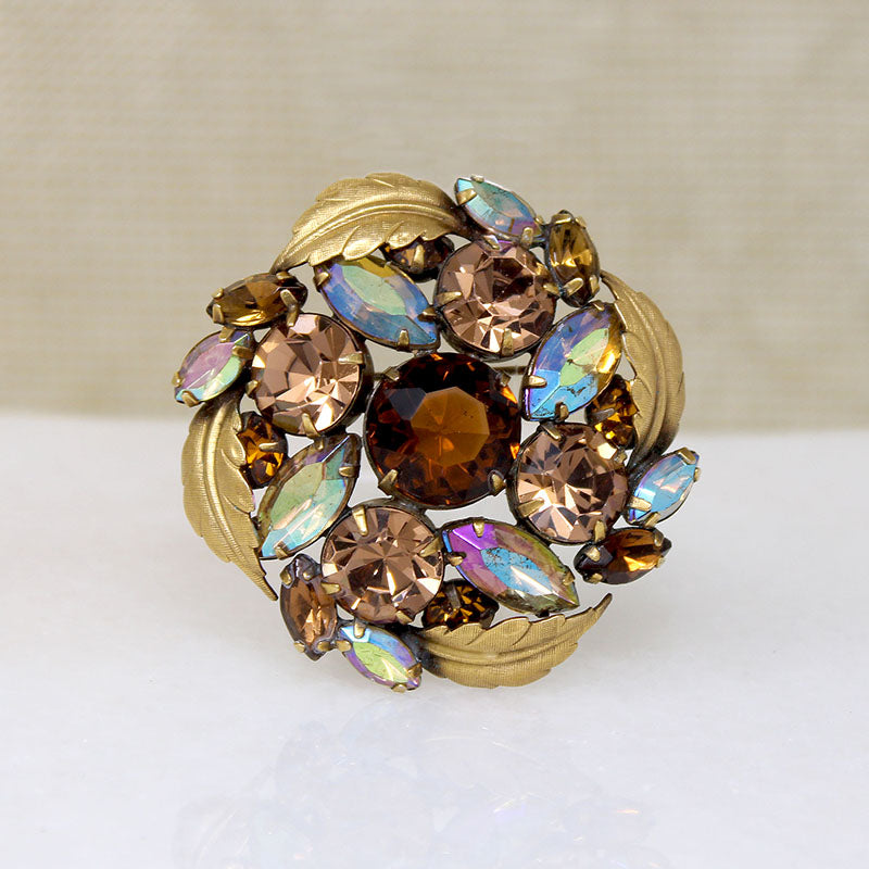 This Mid Century Circle brooch features a mouthwatering combination of root beer crystals and iridescent Aurora Borealis rhinestones. Marquis-cut AB rhinestones swirl around the round root beer crystals; the teal tones amplify the yummy crystal's caramel colors. The sparkling stones are framed in curling gold-tone leaves. Circa 1950.